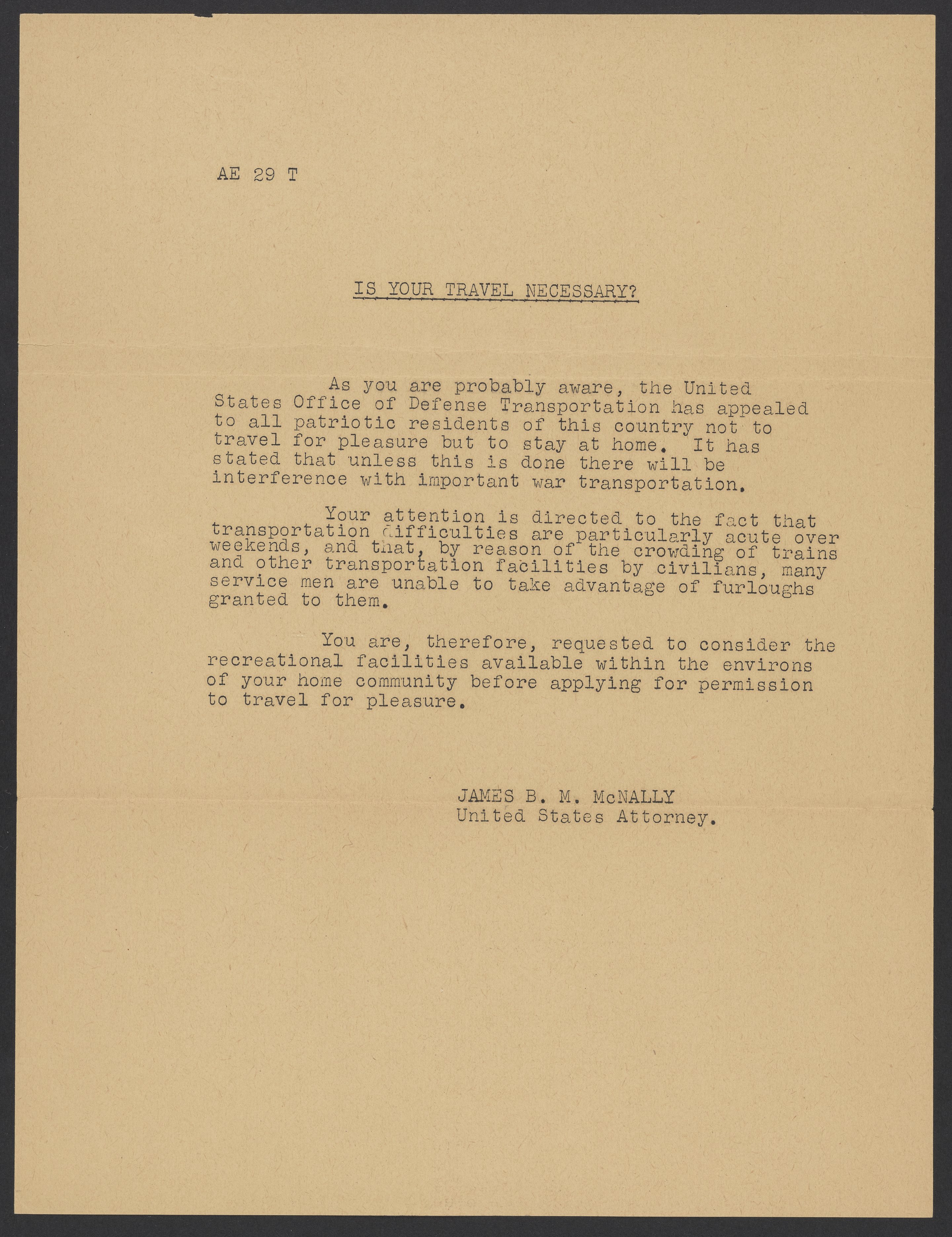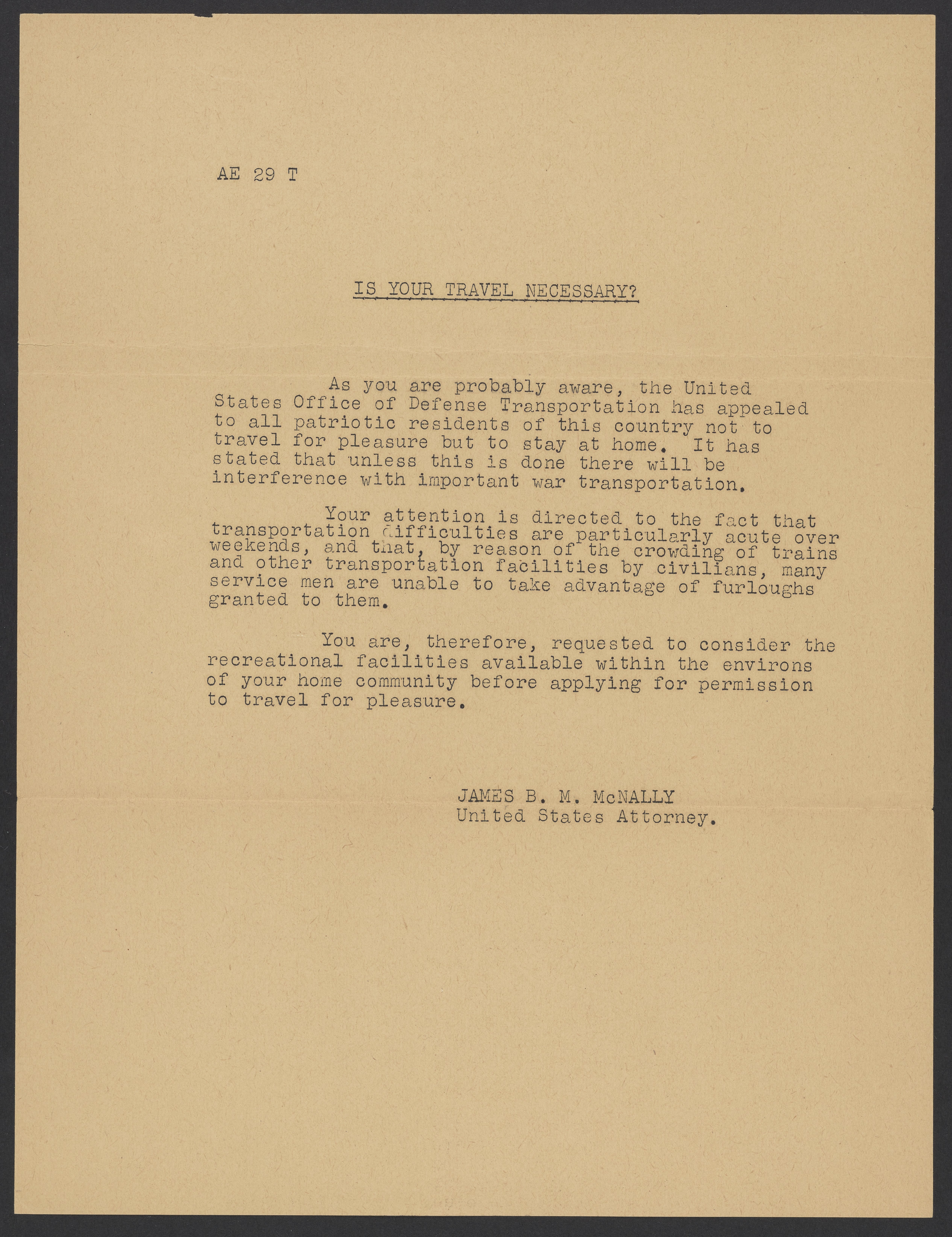 McNally, James B. M. “Is Your Travel Necessary?,” 1943. Papers of Georg and Max Bredig, Box 7, Folder 27. Science History Institute. Philadelphia. https://digital.sciencehistory.org/works/rugzh4g.
