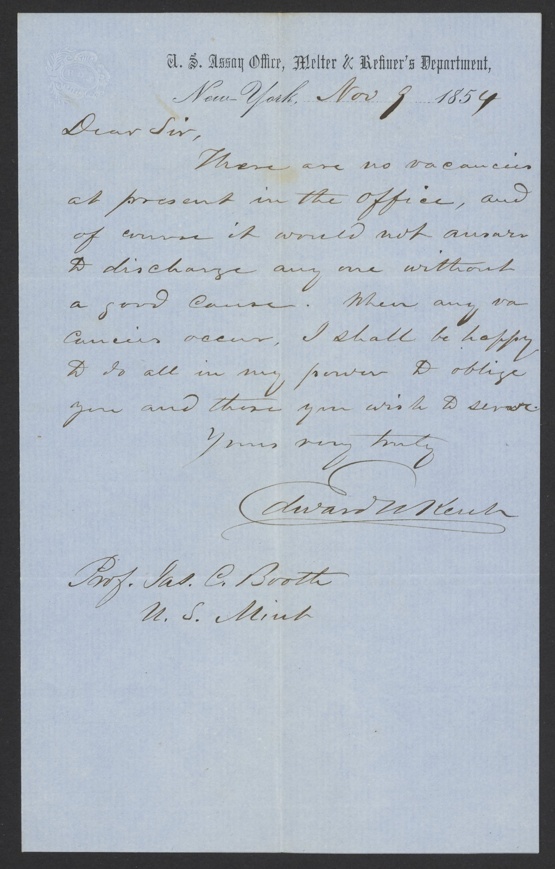 Letter from Edward N. Kent to James Curtis Booth, November 9, 1854