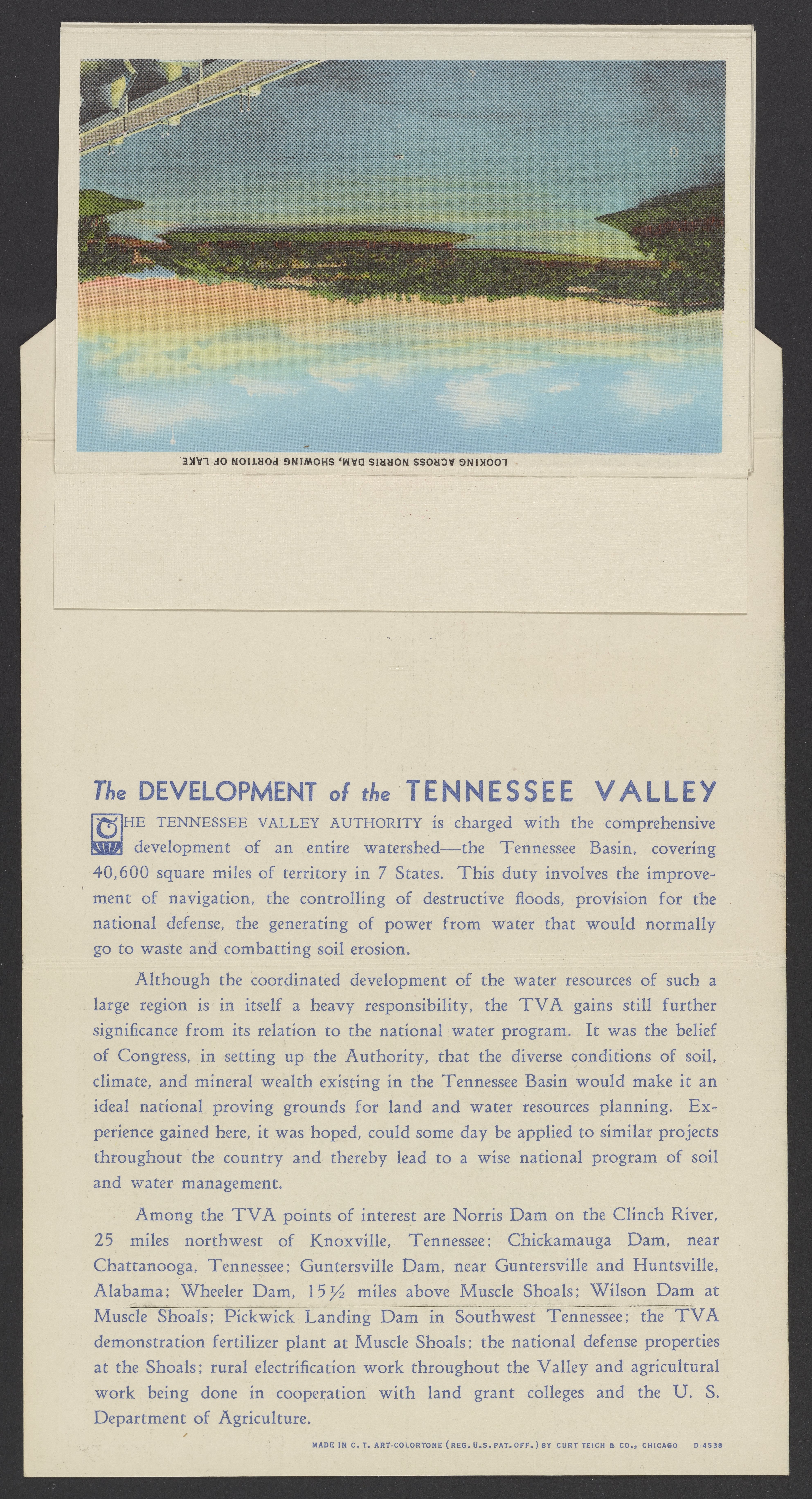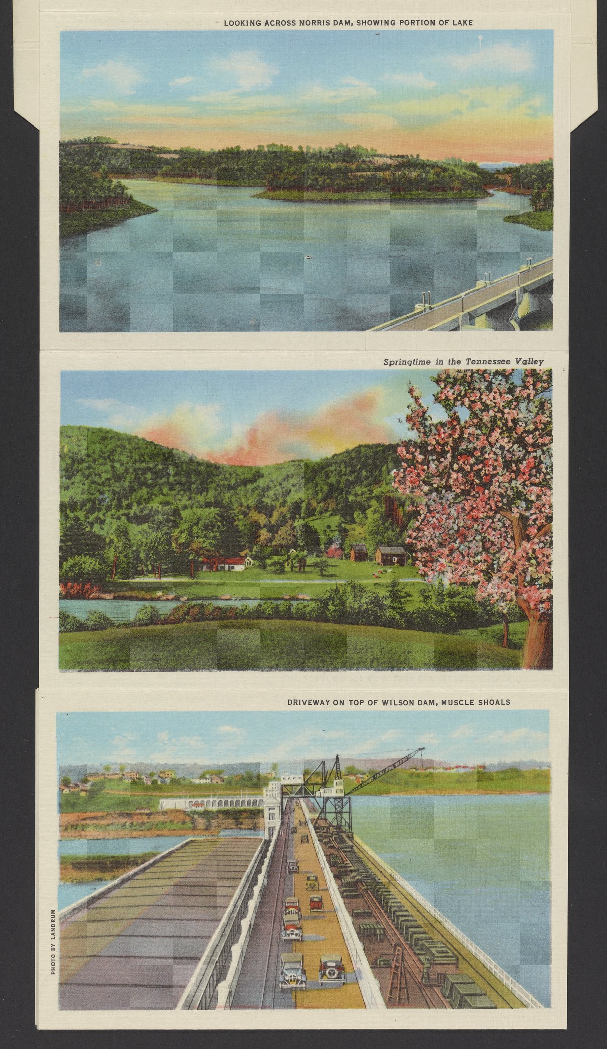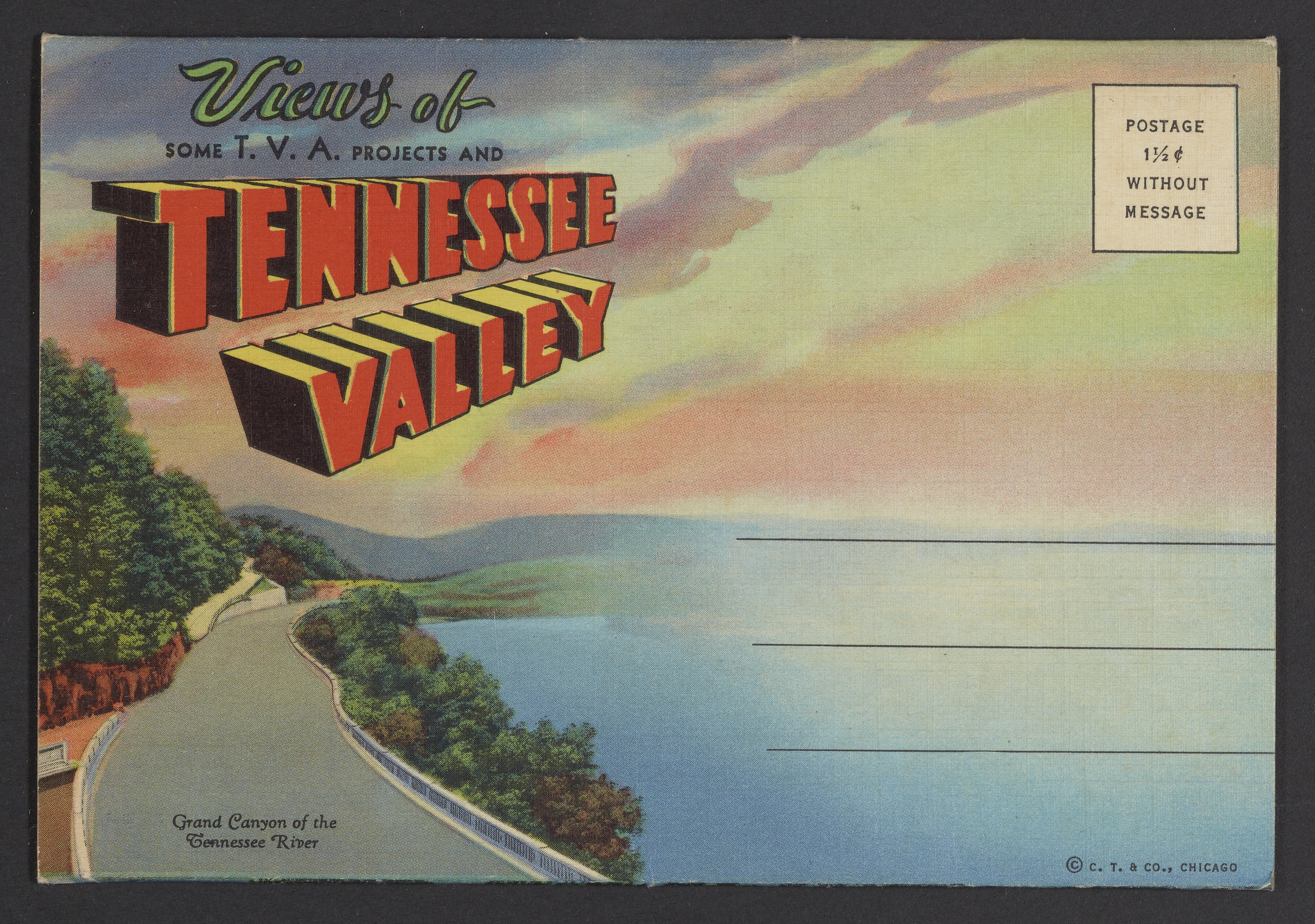 Small JPG1200 x 846px — 243 KBLarge JPG2880 x 2030px — 2.0 MBFull-sized JPG3974 x 2801px — 3.5 MBOriginal fileTIFF — 3974 x 2801px — 31.9 MBLetterpress halftone postcard collection published by Curt Teich & Co. Depicts views of Tennessee and projects by the Tennessee Valley Authority (TVA) including sights such as dams, the TVA Freeway, and model homes in Norris, Tennessee.