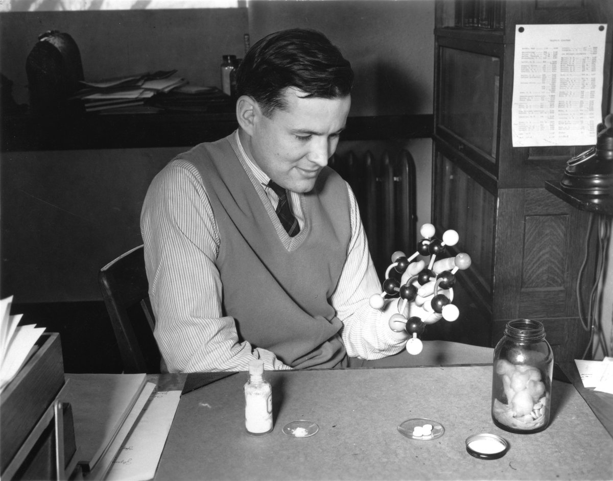 “Charles C. Price with Molecular Model,” 1950–1959. Charles C. Price Photograph Collection, Box 1. Science History Institute. Philadelphia. https://digital.sciencehistory.org/works/rwti7ht.
