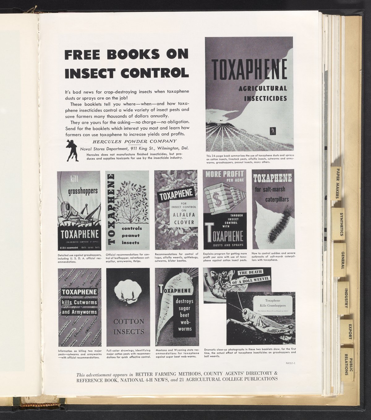 Hercules Incorporated. “Free Books on Insect Control.” 1952 Hercules Advertisements, 1952. Records of Hercules Incorporated, Volume 1952. Science History Institute. Philadelphia. https://digital.sciencehistory.org/works/rx913q76w.