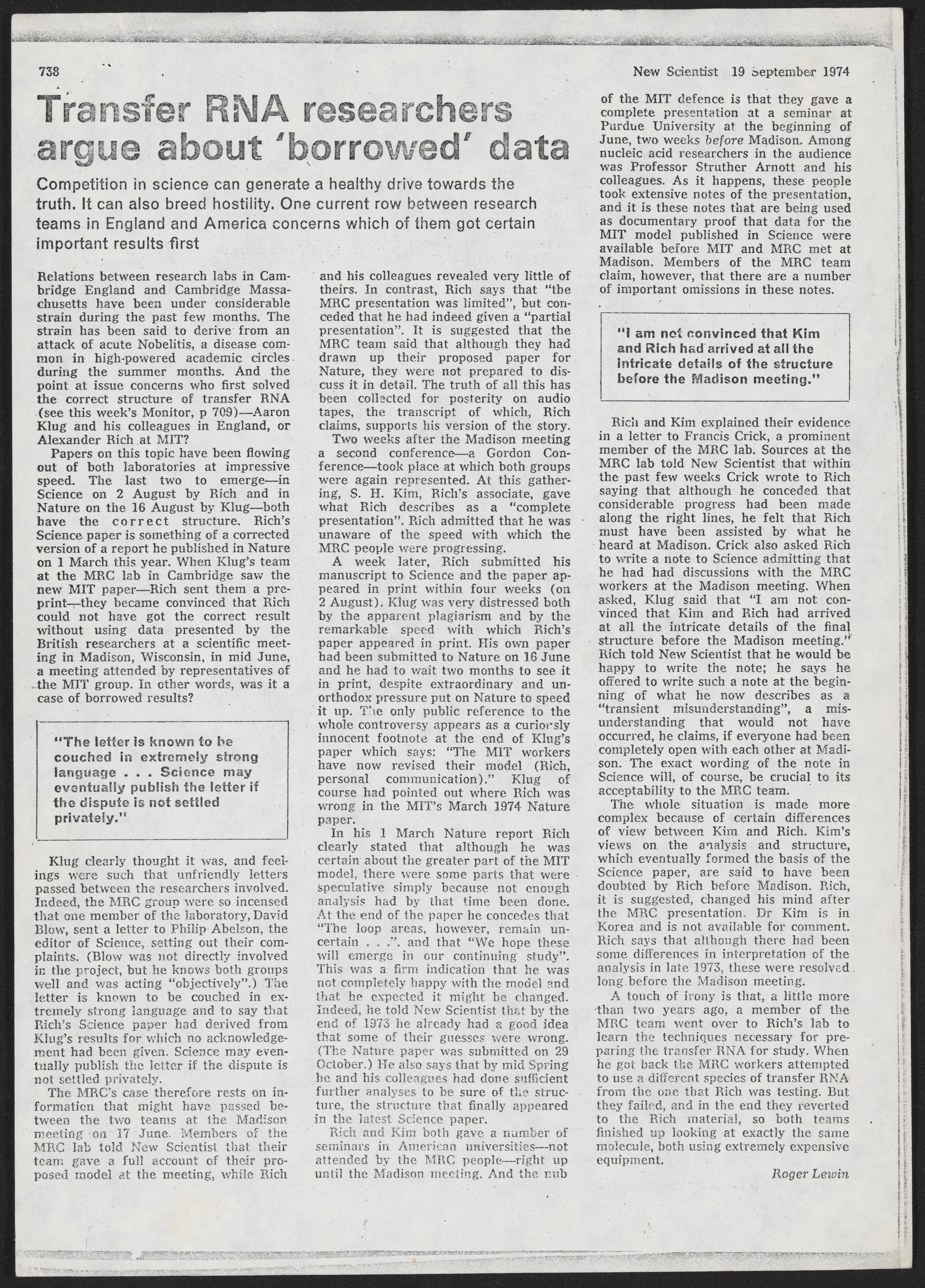 Letter from Francis Crick (1916-2004) to Jon D. Robertus. Crick includes an article titled Transfer RNA researchers argue about 'borrowed' data published in New Scientist, September 19, 1974.