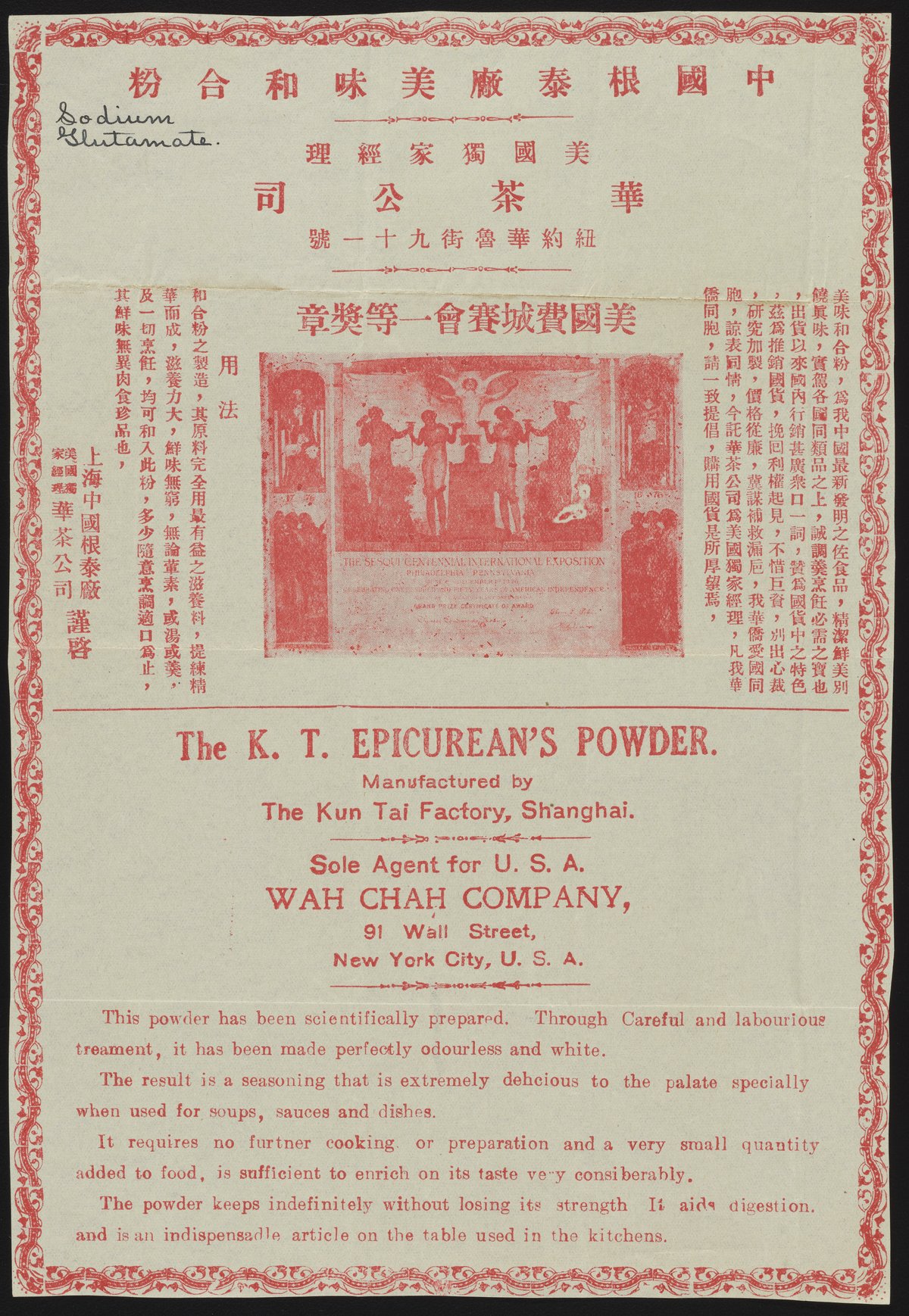 Advertisement for K.T. Epicurean's Powder, a mono sodium glutamate (MSG) food additive product manufactured by the Kun Tai Factory, Shanghai, and distributed in the United States by Wah Chah Company.