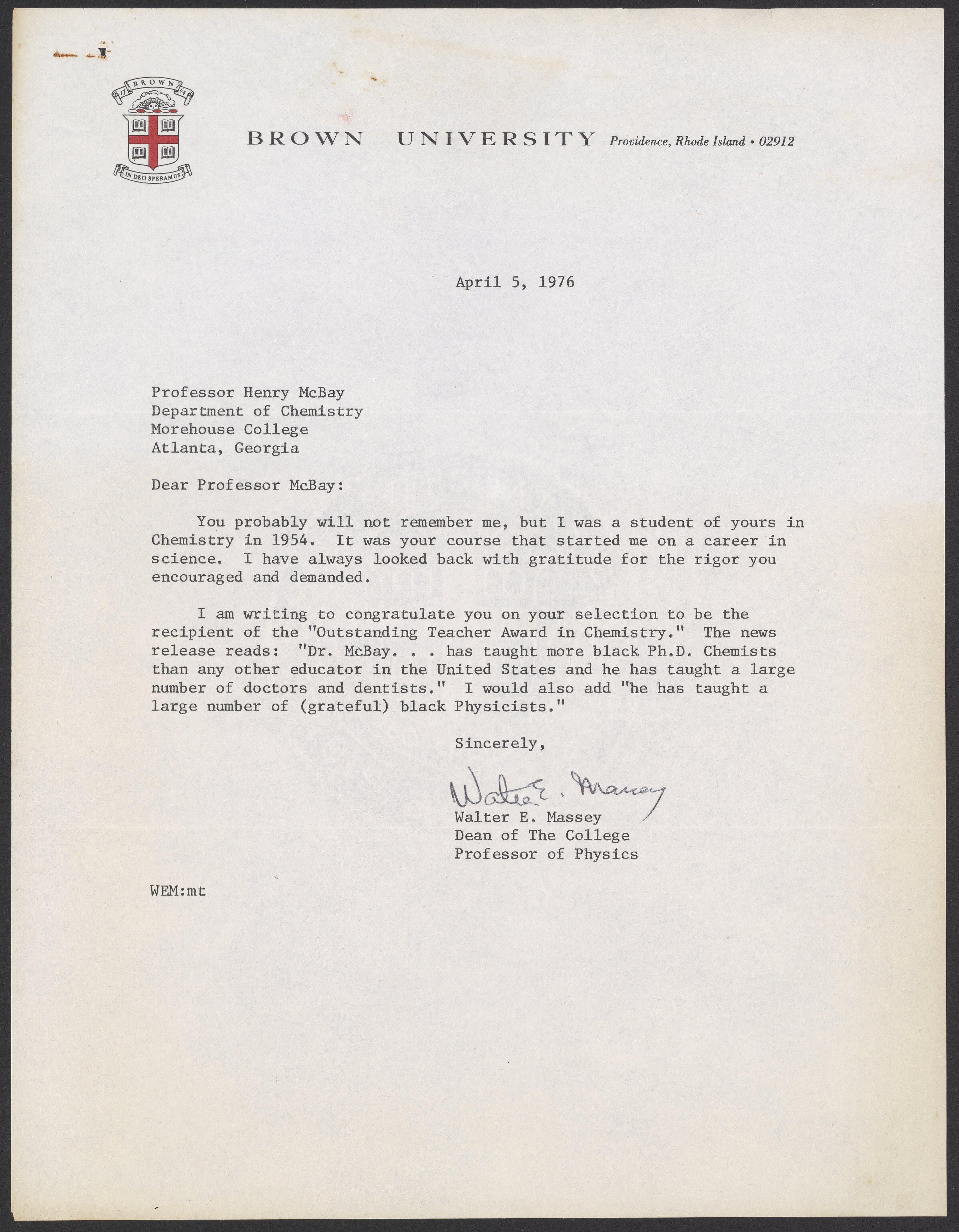 Letter from Dr. Walter E. Massey to Dr. Henry McBay