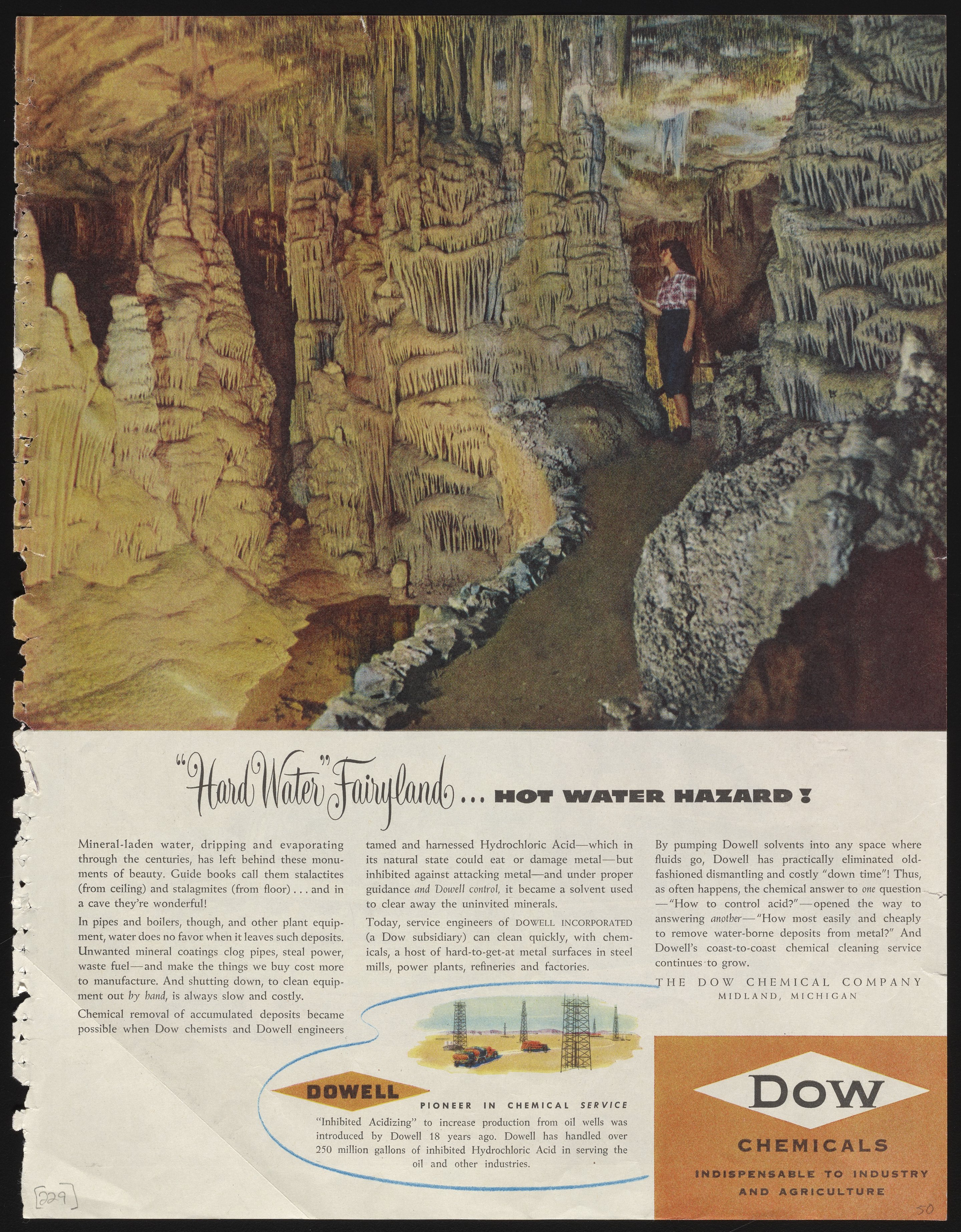 Color print advertisement for Dowell Incorporated, a subsidiary of the Dow Chemical Company. The advertisement depicts a young woman examining stalactites and stalagmites in a cave. The accompanying text details the development of Dowell solvents used to remove water-borne deposits from metal pipes, boilers, and other industrial equipment. This advertisement appeared in the November 4, 1950 edition of The Saturday Evening Post.