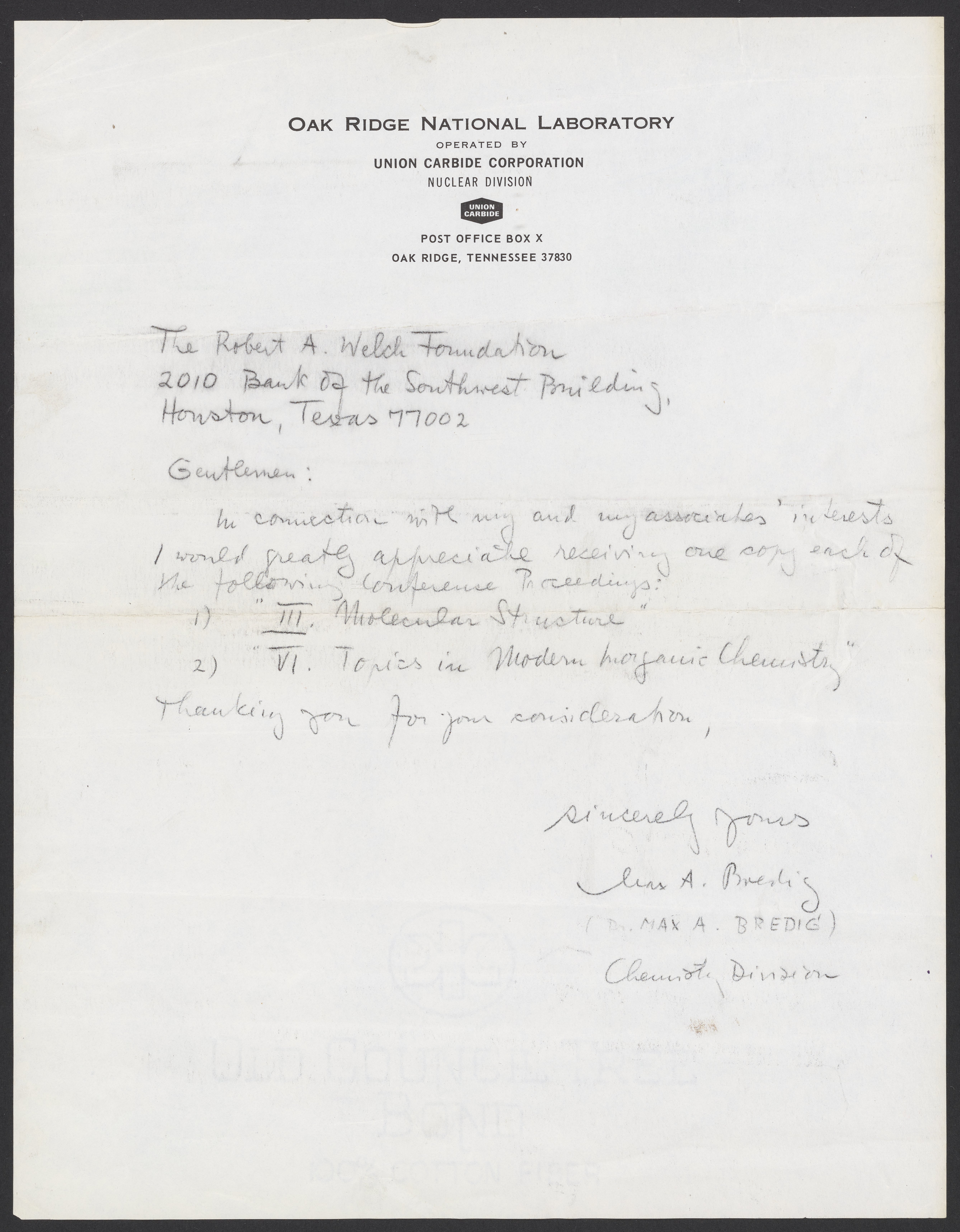 Letter from Max Bredig to The Robert A. Welch Foundation