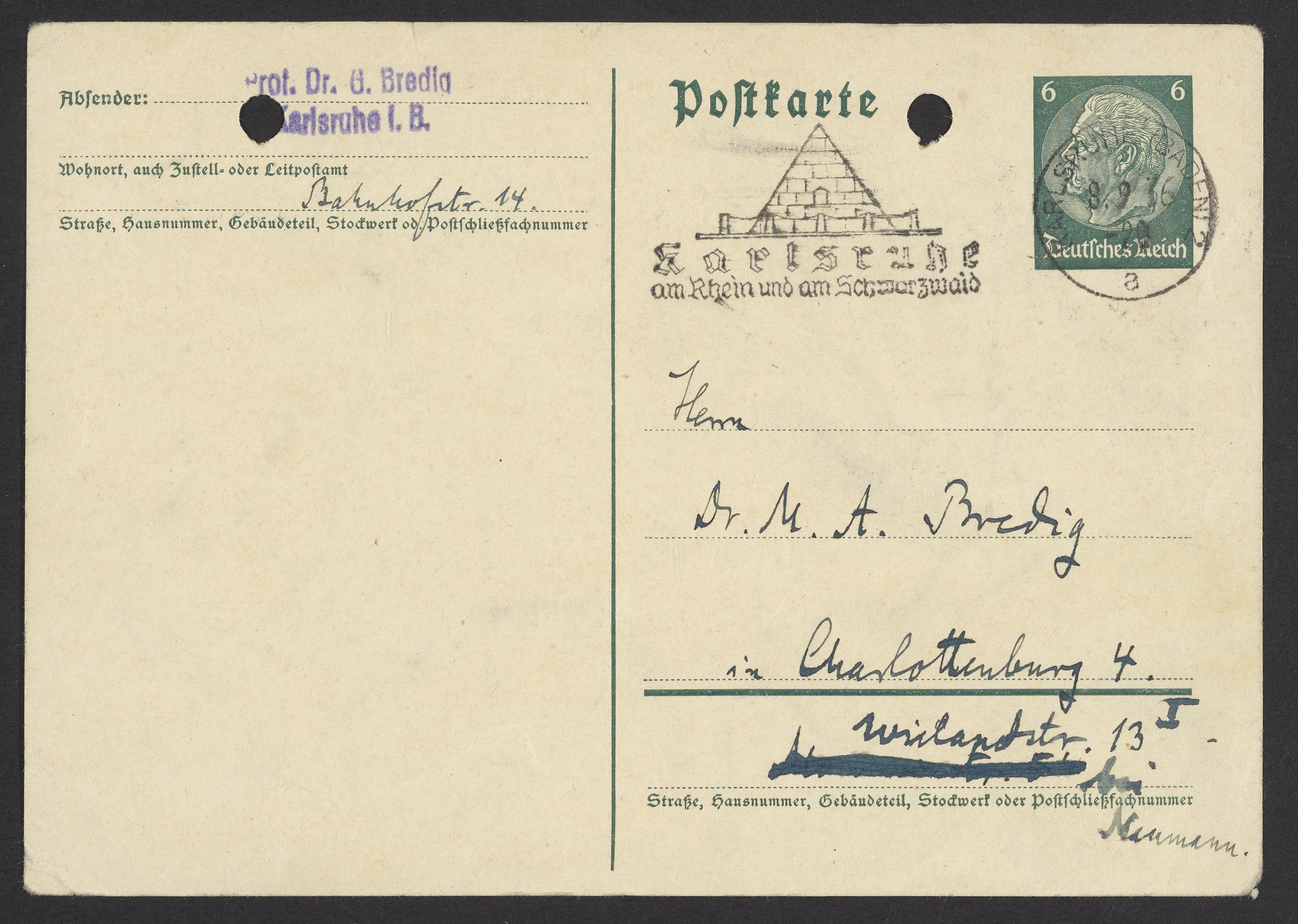 Postcard from Georg Bredig to Max Bredig, September 8, 1936