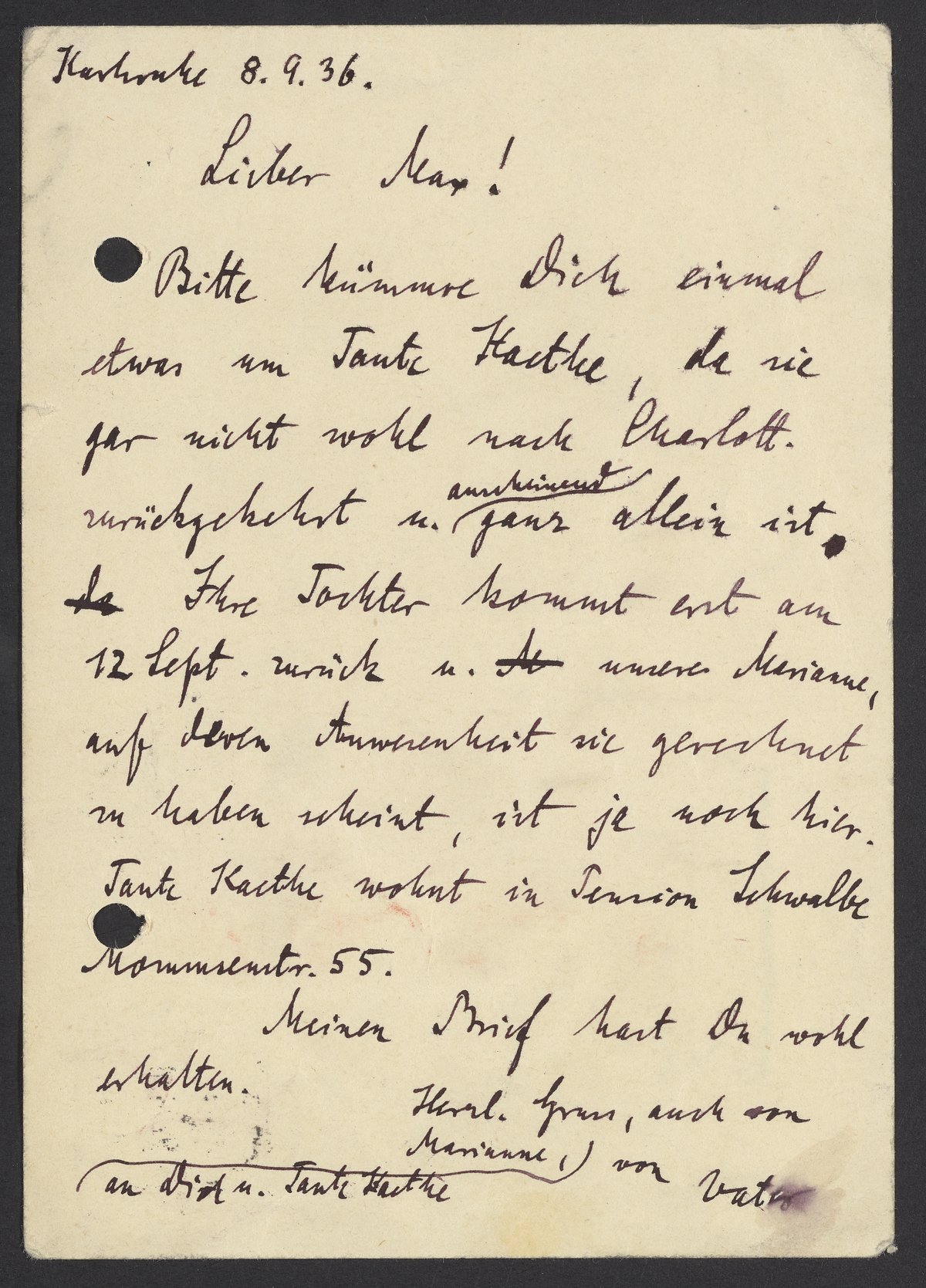 Bitte kümmre Dich einmal etwas um Tante Kathe, die gar nicht wohl nach Charlott. zurückgekehrt ist u. anscheinend ganz allein ist. Ihr Tochter kommt am. 12. Sept. zurück u. unsere Marianne, auf deren Anwesenheit sie gerechnet zu haben scheint, ist je noch hier. Tante Kathe wohnt in Pension Schwalbe, Mommsenstr. 55.
