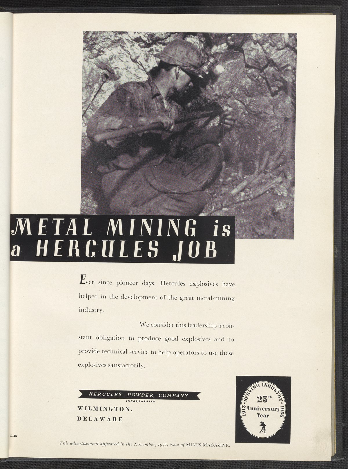Hercules Incorporated. “Metal Mining Is a Hercules Job.” 1937 Hercules Advertisements, 1937. Records of Hercules Incorporated, Volume 1937. Science History Institute. Philadelphia. https://digital.sciencehistory.org/works/s7526d25f.