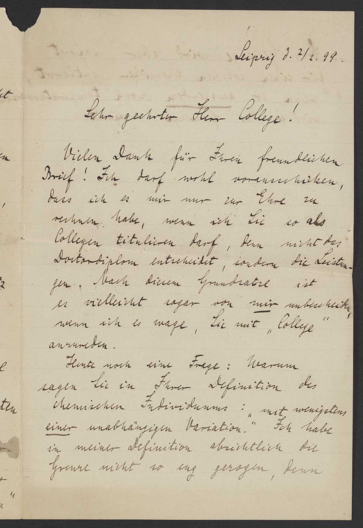 Letter from Georg Bredig to a colleague, February 2, 1899