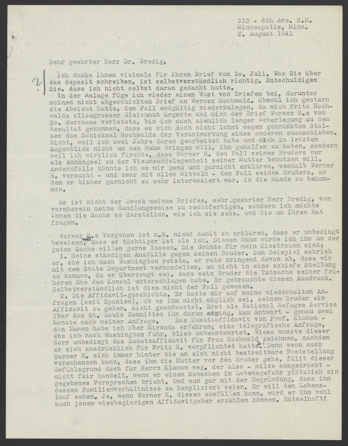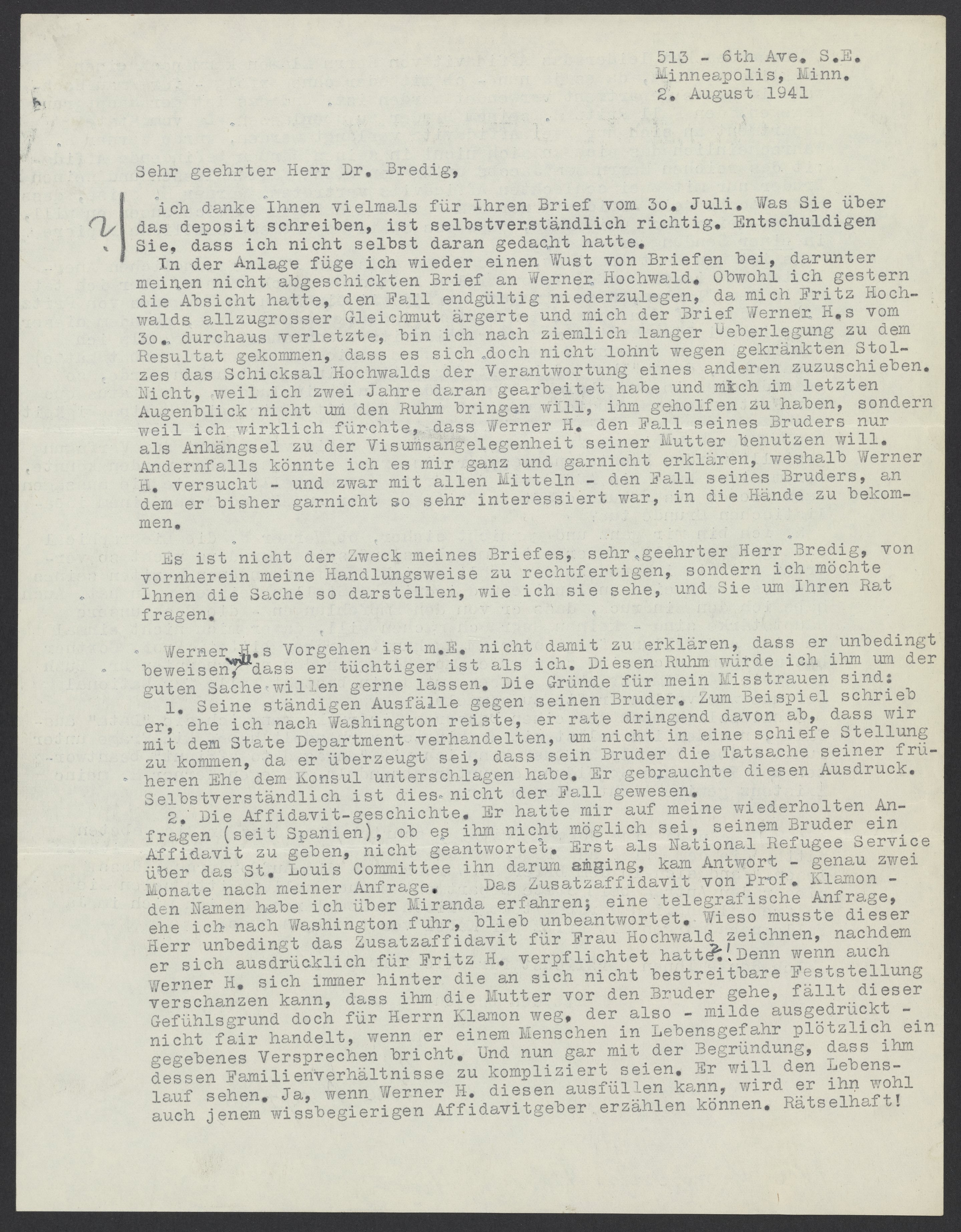 ich danke Ihnen vielmals für Ihren Brief vom 30. Juli. Was Sie über das deposit schreiben, ist selbstverständlich richtig. Entschuldigen Sie, dass ich nicht selbst daran gedacht hatte. In der Anlage füge ich wieder einen Wust von Briefen bei, darunter meinen nicht abgeschickten Brief an Werner Hochwald. Obwohl ich gestern die Absicht hatte, den Fall endgültig niederzulegen, da mich Fritz Hochwalds allzugrosser Gleichmut ärgerte und mich der Brief Werner H.s vom 30. durchaus verletzte, bin ich nach ziemlich langer Überlegung zu dem Resultat gekommen, dass es sich doch nicht lohnt wegen gekränkten Stolzes das Schicksal Hochwalds der Verantwortung eines anderen zuzuschieben. Nicht, weil ich zwei Jahre daran gearbeitet habe und mich im letzten Augenblick nicht um den Ruhm bringen will, ihm geholfen zu haben, sondern weil ich wirklich fürchte, dass Werner H. den Fall seines Bruders nur als Anhängsel zu der Visumsangelegenheit seiner Mutter benutzen will. Andernfalls könnte ich es mir ganz und garnicht erklären, weshalb Werner H. versucht - und zwar mit allen Mitteln - den Fall seines Bruders, an dem er bisher garnicht so sehr interessiert war, in die Hände zu bekommen.