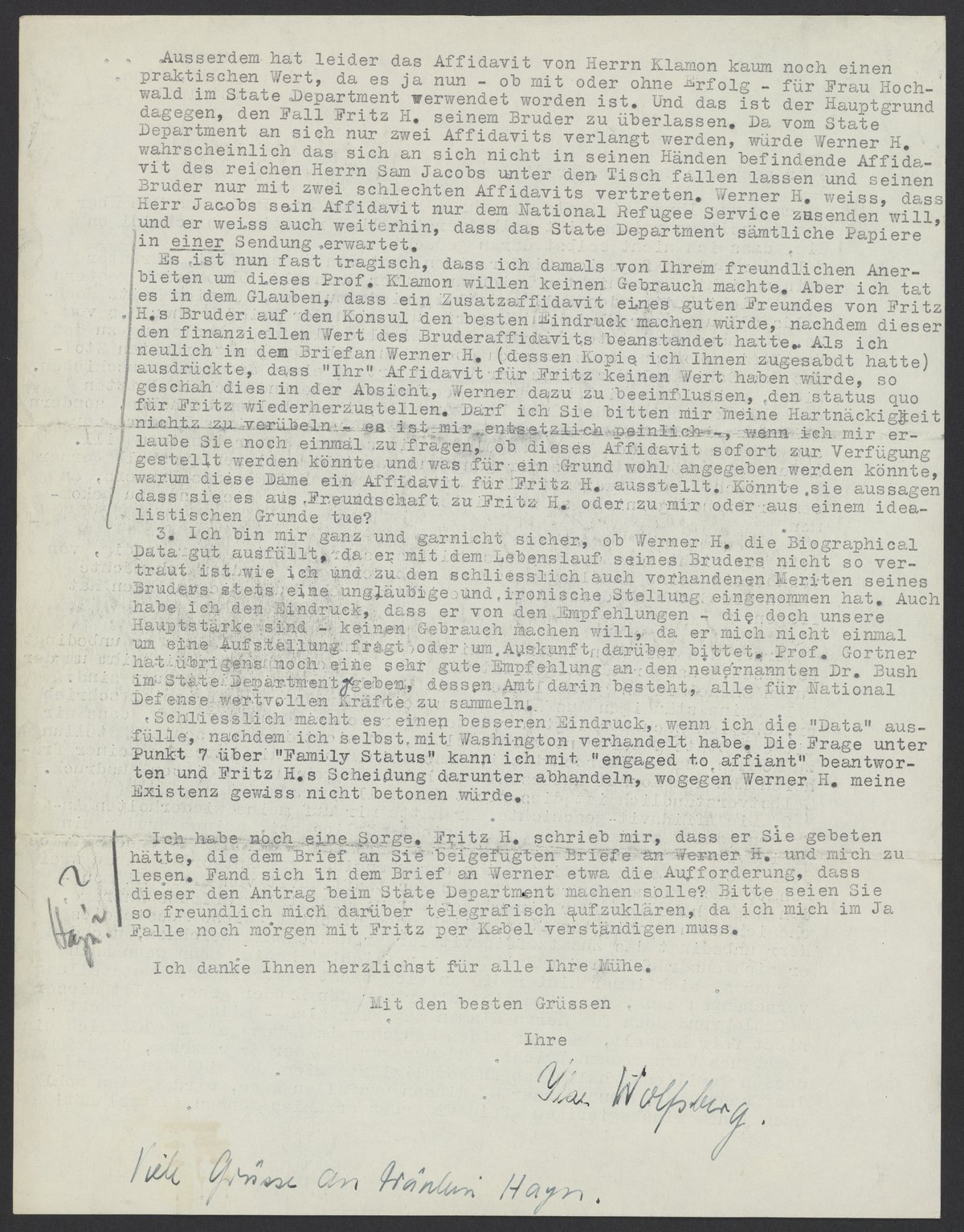 Es ist nun fast tragisch, dass ich damals von Ihrem freundlichen Anerbieten um dieses Prof. Klamon willen keinen Gebrauch machte. Aber ich tat es in dem Glauben, dass ein Zusatzaffidavit eines guten Freundes von Fritz H.s Bruder auf den Konsul den besten Eindruck machen würde, nachdem dieser den finanziellen Wert des Bruderaffidavits beanstandet hatte. Als ich neulich in dem Brief an Werner H. (dessen Kopie ich Ihnen zugesandt hatte) ausdrückte, dass „Ihr“ Affidavit für Fritz keinen Wert haben würde, so geschah dies in der Absicht, Werner dazu zu beeinflussen, „den status quo“ für Fritz wiederherzustellen. Darf ich Sie bitten mir meine Hartnäckigkeit nicht zu verübeln - es ist mir entsetzlich peinlich, wenn ich mir erlaube Sie noch einmal zu fragen, ob dieses Affidavit sofort zur Verfügung gestellt werden könnte und was für ein Grund wohl angegeben werden könnte warum diese Dame ein Affidavit für Fritz H. ausstellt. Könnte, sie aussagen dass sie es aus Freundschaft zu Fritz H. oder zu mir oder aus einem idealistischen Grunde tue?