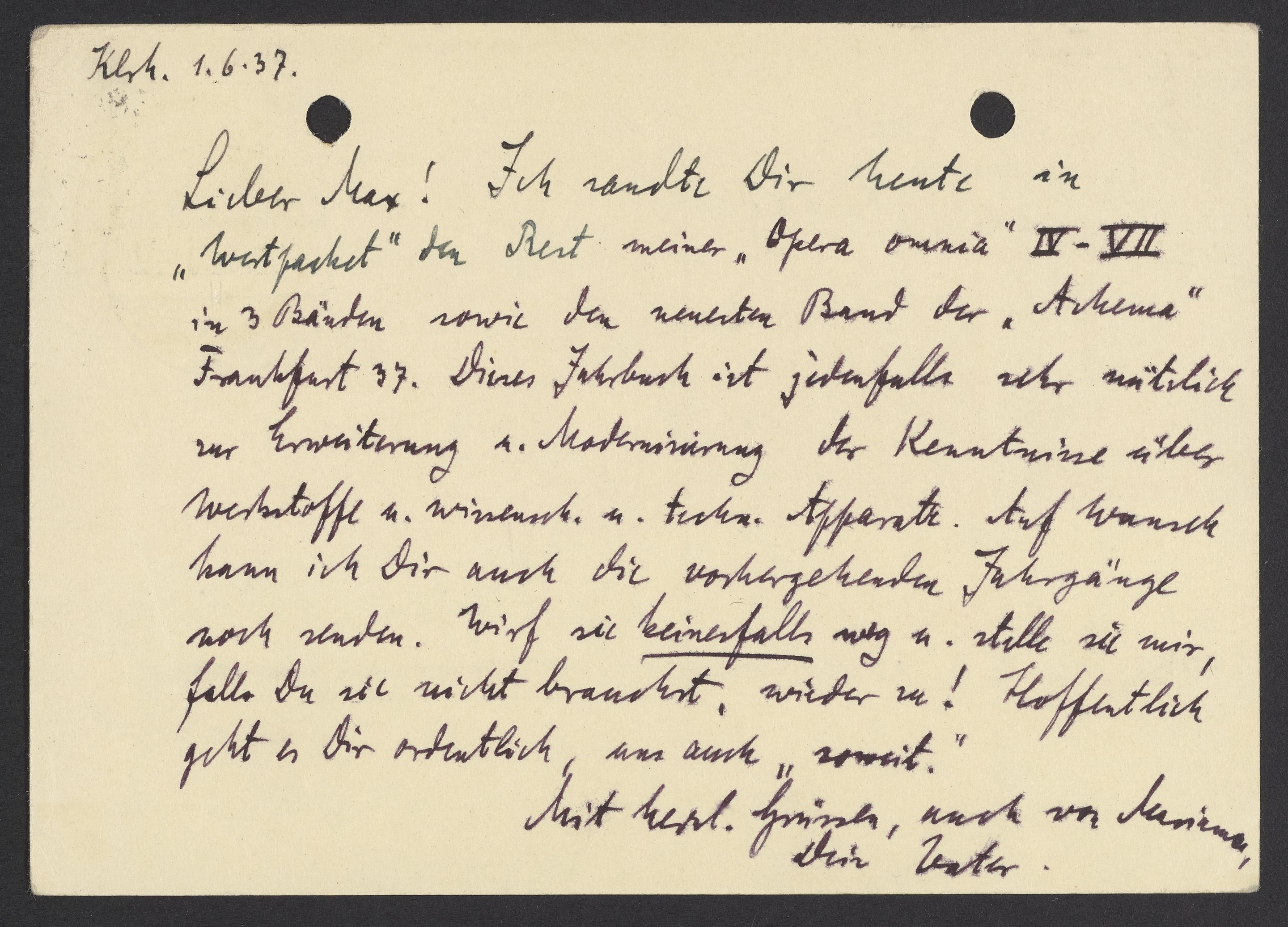 Lieber Max! Ich sandte Dir heute in „Wertpacket“ den Rest meiner „Opera Omnia“ IV-VII in 3 Bänden sowie den neunten Band der „Akema“ Frankfurt 37. Dieses Jahrbuch ist jedenfalls sehr nützlich zur Erweiterung u. Modernisierung der Kenntnisse über Werkstoffe u. wissensch. U. techn. Apparate. Auf Wunsch kann ich Dir auch die vorhergehenden Jahrgänge noch senden. Wirf sie keinesfalls weg u. stelle sie mir, falls Du sie nicht brauchst, wieder zu! Hoffentlich geht es Dir ordentlich, uns auch soweit.