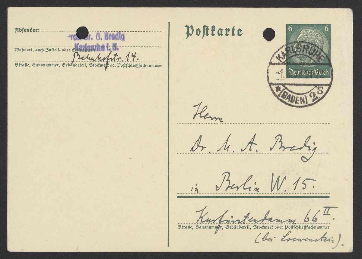 Bredig, Georg. “Postcard from Georg Bredig to Max Bredig, June 1, 1937,” June 1, 1937. Papers of Georg and Max Bredig, Box 7, Folder 13. Science History Institute. Philadelphia. https://digital.sciencehistory.org/works/sdhcen1.