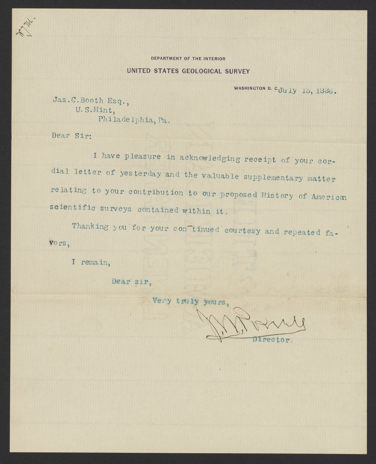 Letter from John Wesley Powell to James Curtis Booth, July 15, 1886