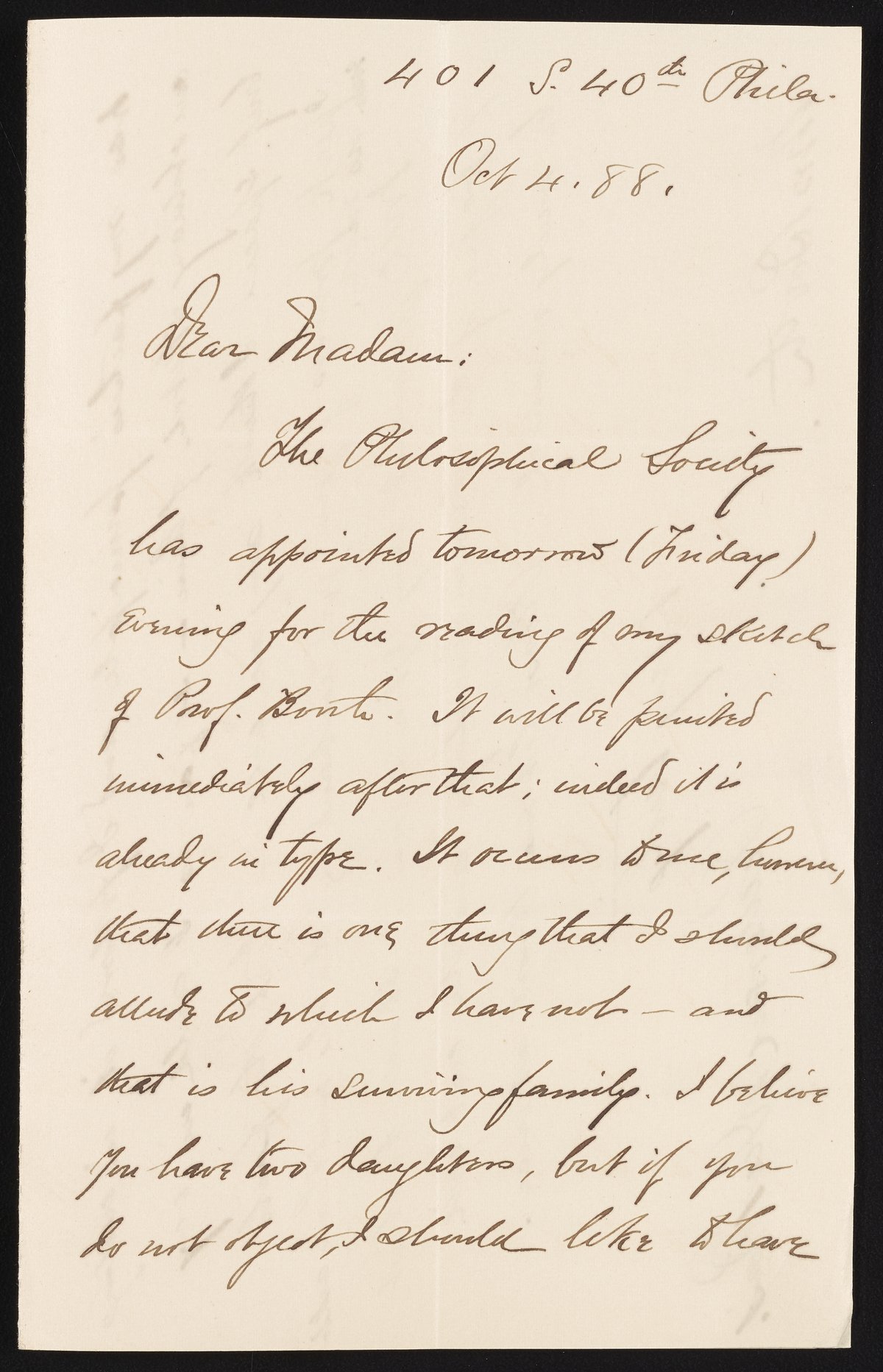 Bois, Patterson Du. “Letter from Patterson Du Bois to Margaret M. Booth, October 4, 1888,” October 4, 1888. Papers of James Curtis Booth, Box 2, Folder 7. Science History Institute. Philadelphia. https://digital.sciencehistory.org/works/sfk3235.