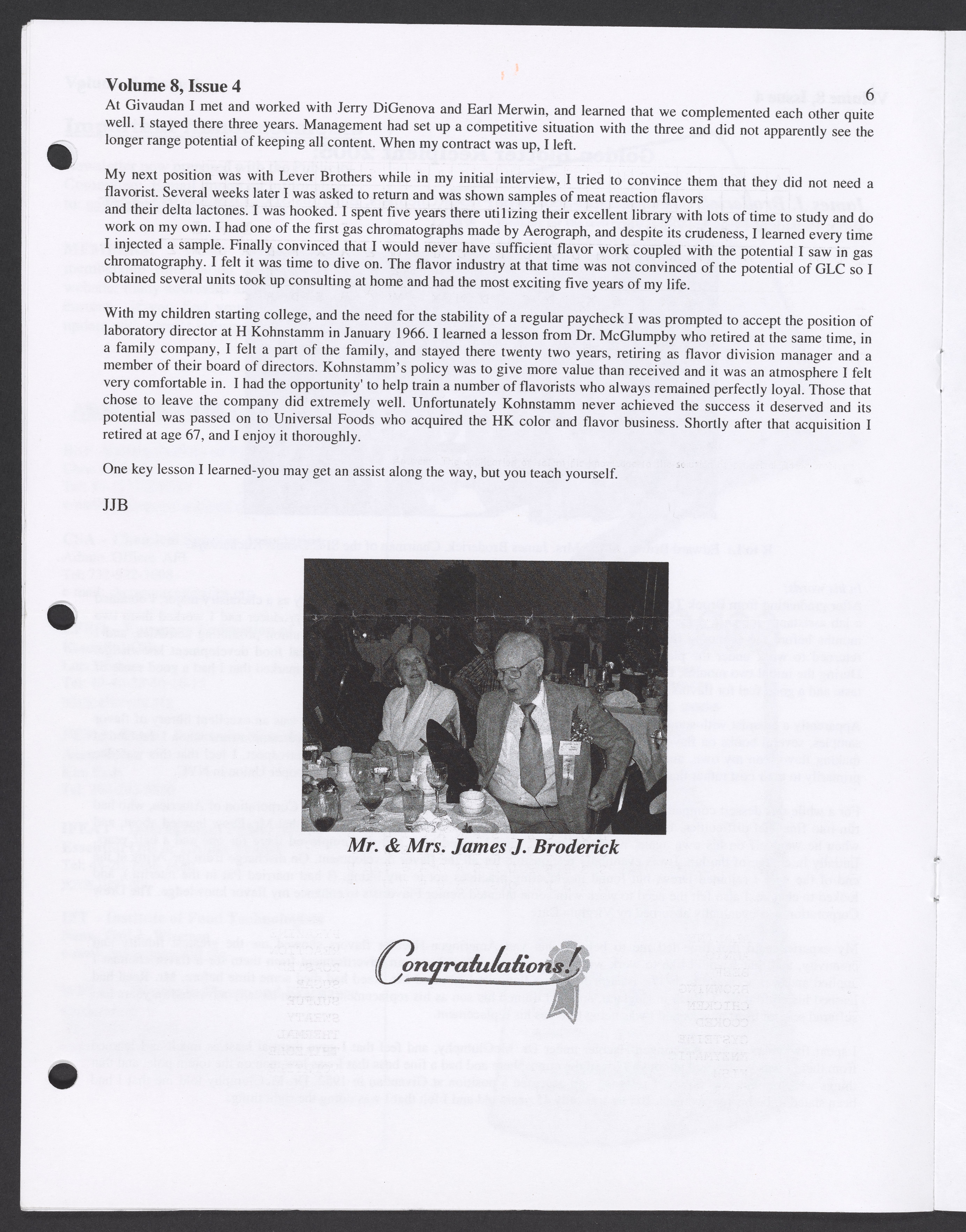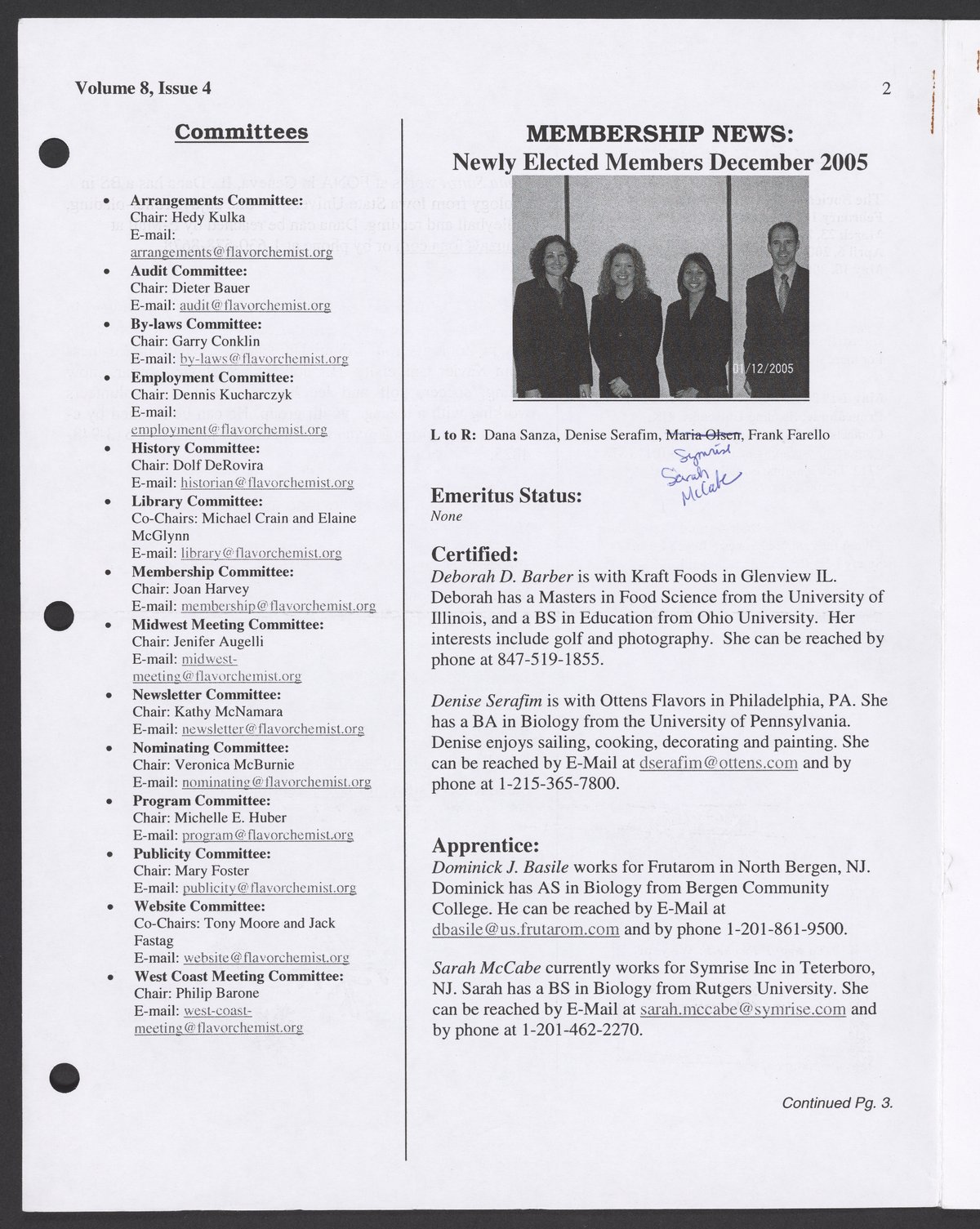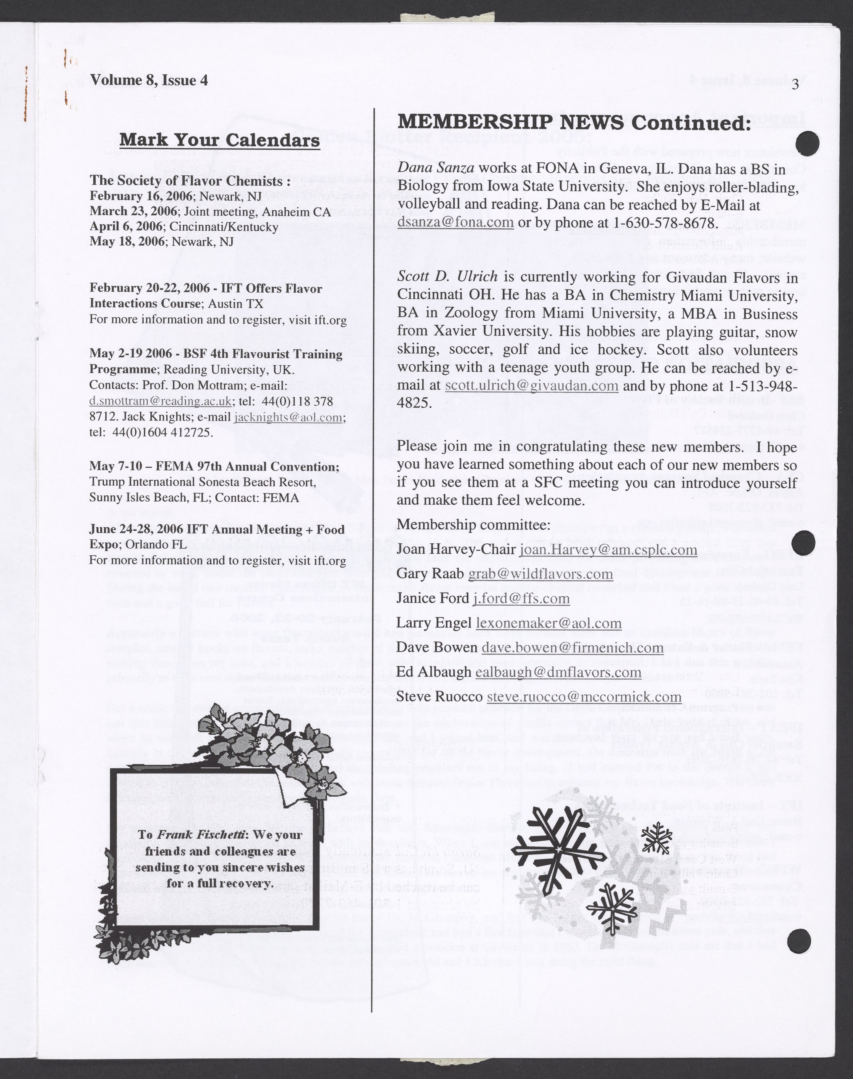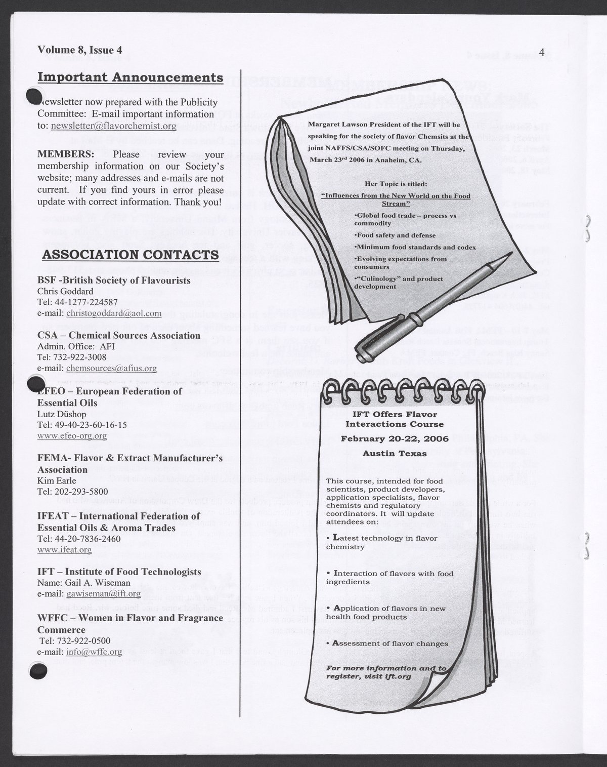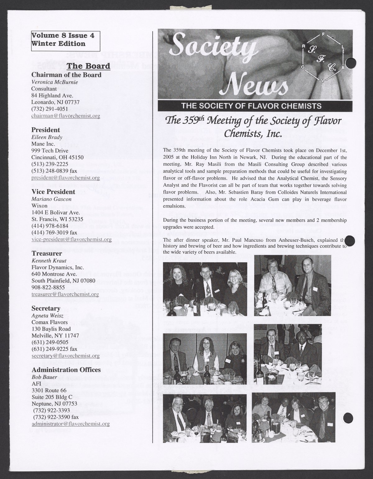 Society of Flavor Chemists. “Society News, Volume 8, Issue 4,” 2005. Society of Flavor Chemists, Society News, Box 1, Folder 2. Science History Institute. Philadelphia. https://digital.sciencehistory.org/works/shxxfa3.