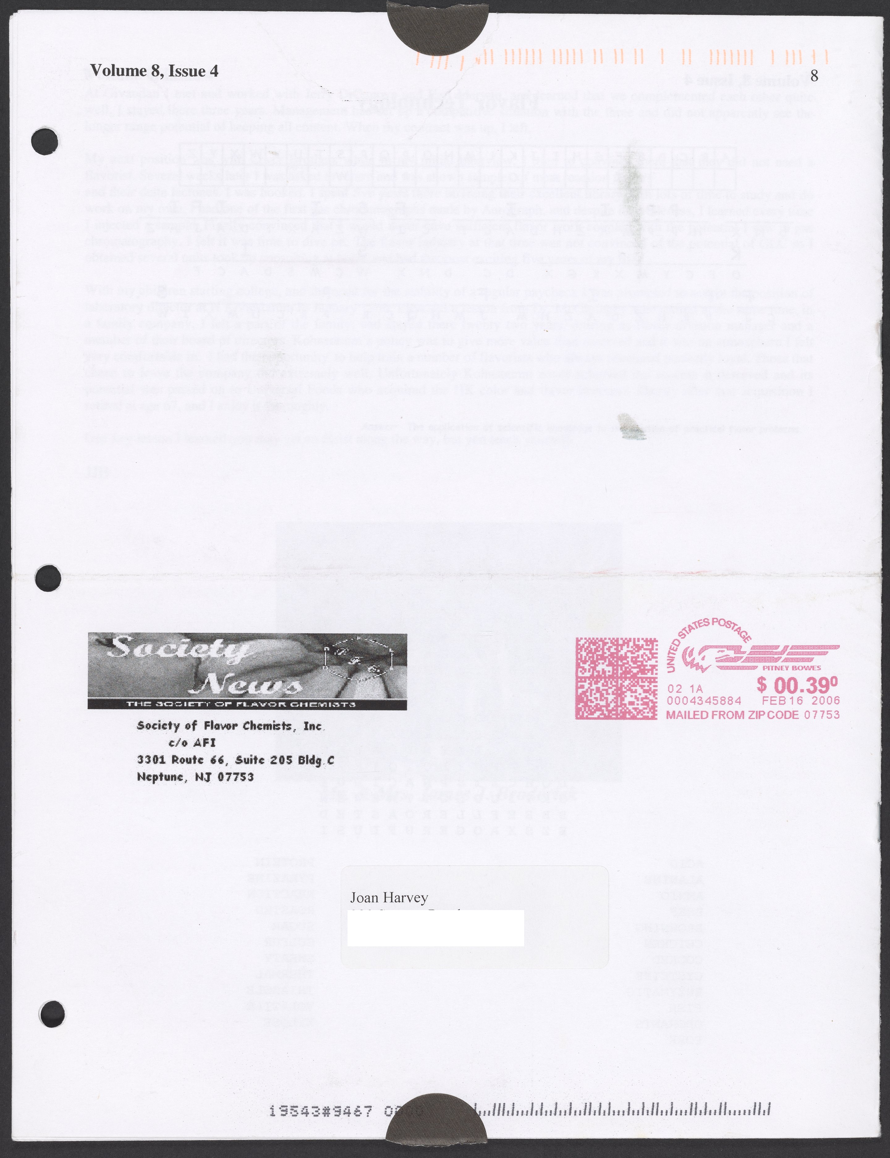 Small JPG1200 x 1540px — 354 KBLarge JPG2880 x 3695px — 2.2 MBFull-sized JPG5508 x 7067px — 7.3 MBOriginal fileTIFF — 5508 x 7067px — 111 MBWinter 2005 issue of the Society News, the Society of Flavor Chemists newsletter. The addressee's mailing address has been redacted for privacy purposes.