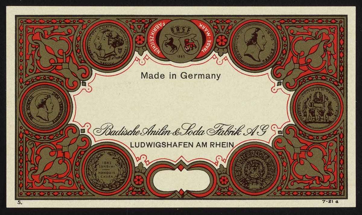 Founded in 1865, Badische Anilin & Soda-Fabrik (BASF) was once the largest chemical factory in the world. Based in Ludwigshafen, Germany, the company first concentrated on the manufacture of synthetic dyestuffs. Key breakthroughs came in the form of the industrial production of synthetic indigo (1897) and the discovery of the indanthrene dyes (1901). Aniline dyes determined much of the firm's business. The company primarily advertised by submitting its products for awards at regional and international industrial trade fairs, especially world's fairs.