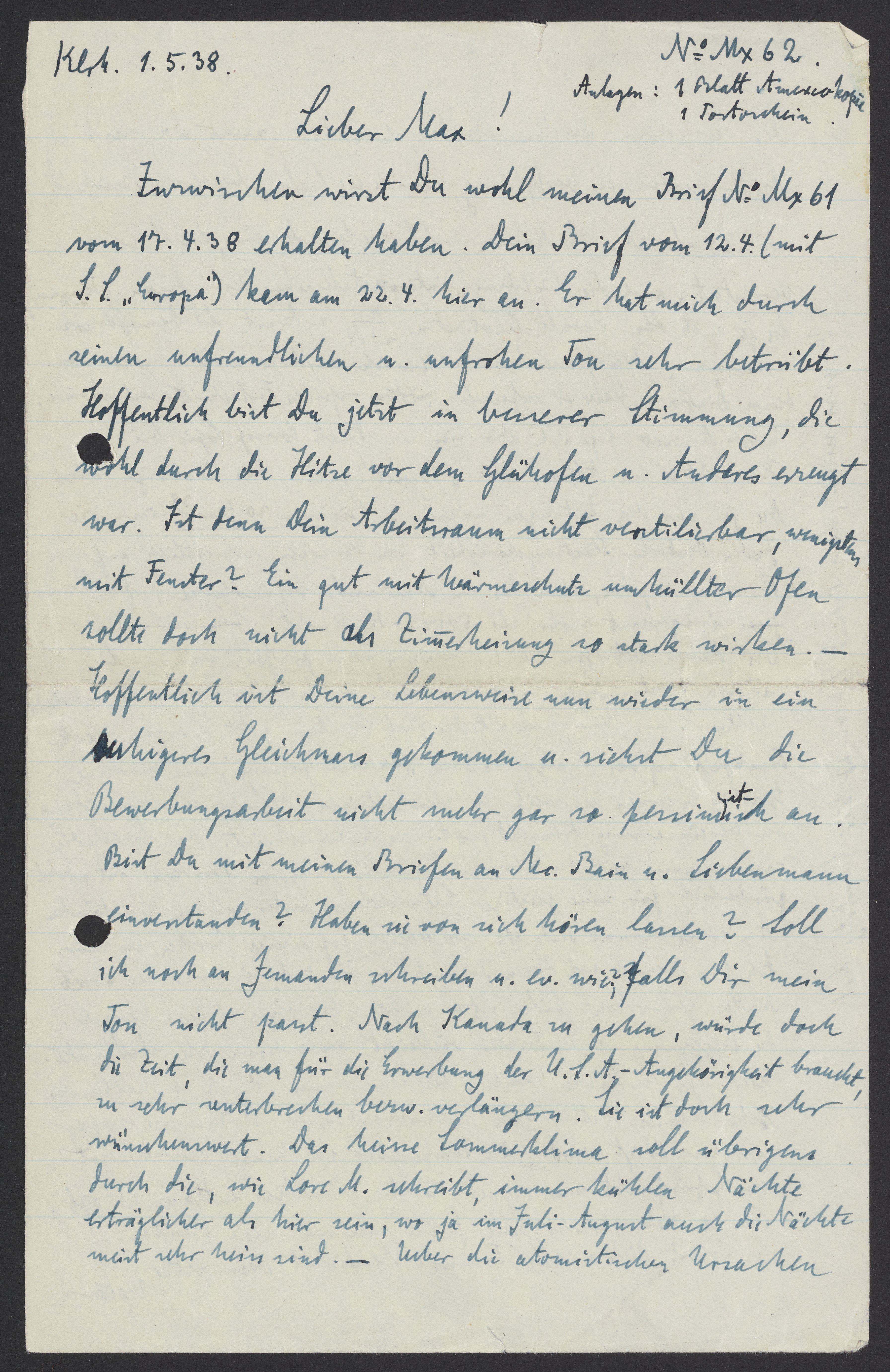 By now, you must have received my letter No. Mx 61 from April 17, 1938. Your letter from April 12th (with the S.S. “Europe”) arrived here on April 22nd. It saddened me greatly with its unfriendly and unhappy tone. I hope you are in a better mood now. Your previous temperament was probably caused by the heat from the annealing furnace and other things. Isn’t your workroom ventilated, at least with a window? A stove that is well covered with heat protection shouldn’t warm a room so intensely.