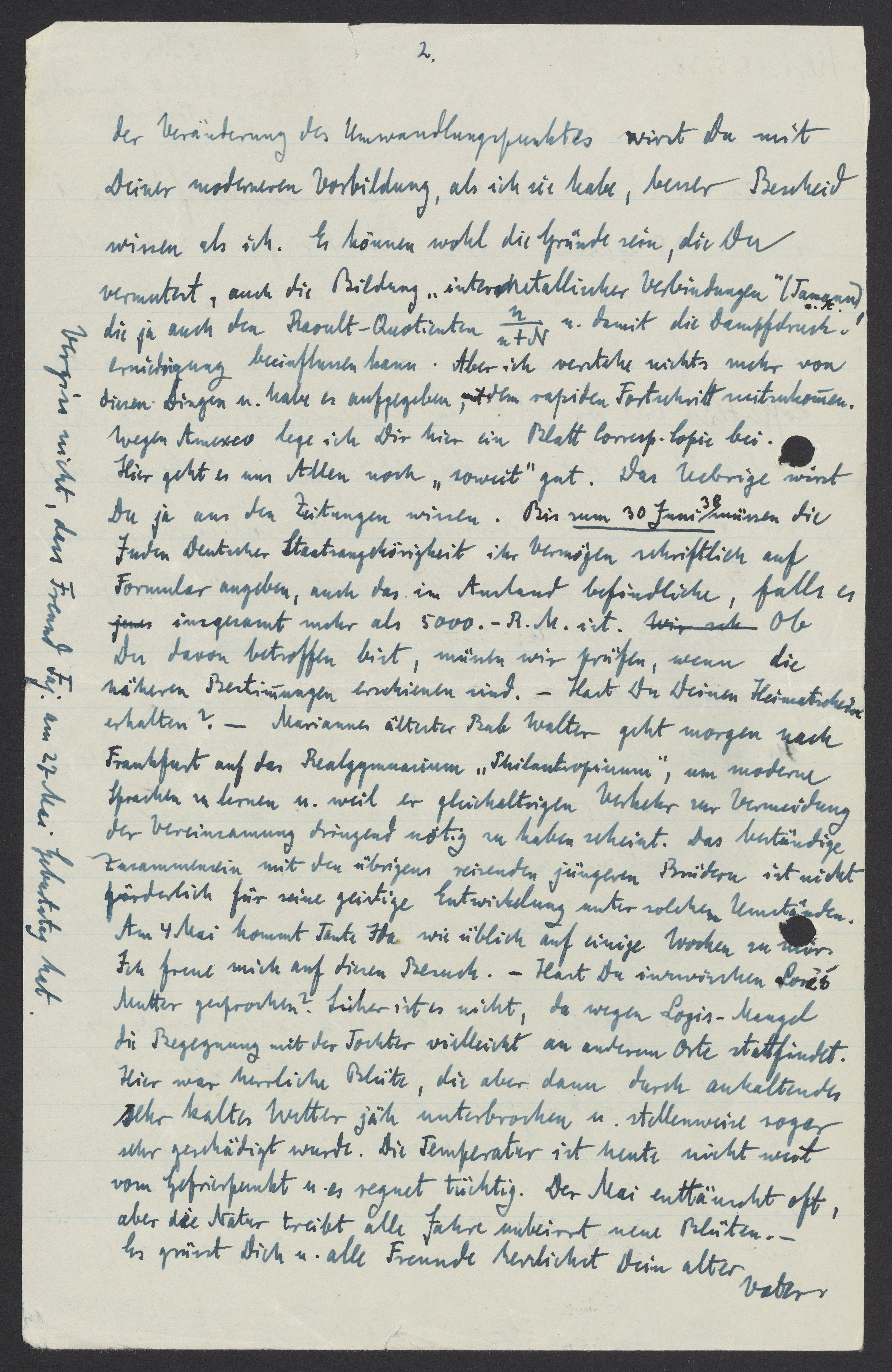 We are all doing well here so far. You will know the rest from the newspapers. By June 30, 1938, Jews with German citizenship must declare their assets in writing on a form, including assets abroad if they total more than 5,000 Reichsmarks. We will have to check whether you are affected by this when the detailed provisions are published. Did you receive your residence certificate? Marianne’s eldest boy Walter is going to the “Philanthropinum” high school in Frankfurt tomorrow to learn modern languages. He also appears to urgently need socialization with peers to avoid loneliness. After all, constantly being with his younger brothers is not conducive to his intellectual development under such circumstances. On May 4th, Aunt Ida is coming to see me for a few weeks, as usual. I look forward to her visit. Have you spoken to Lore’s mother in the meantime? It’s not certain. Due to the lack of accommodations, the visit with her daughter may take place at a different location.