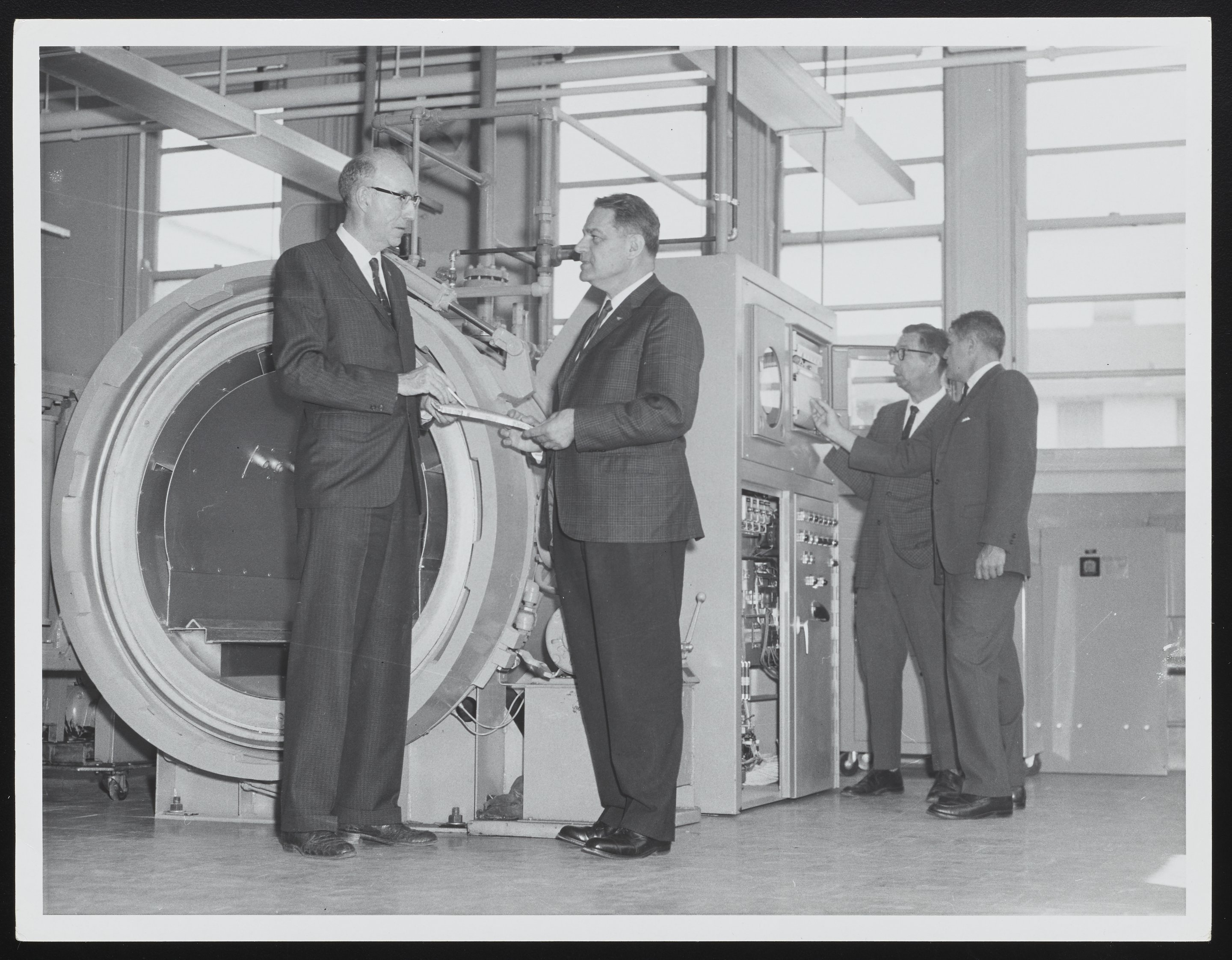 General view of an autoclave, used for the fabrication of plastics, at the Naval Air Engineering Center's Aeronautical Materials Laboratory. In the foreground, Laboratory Technical Director J. Hartley Bowen, Jr. converses with Division Superintendent C.A. Cassola, while in the background Technician Joseph Jamsky (left) and Chemist Robert Grubb (right) examine the autoclave's control panel.