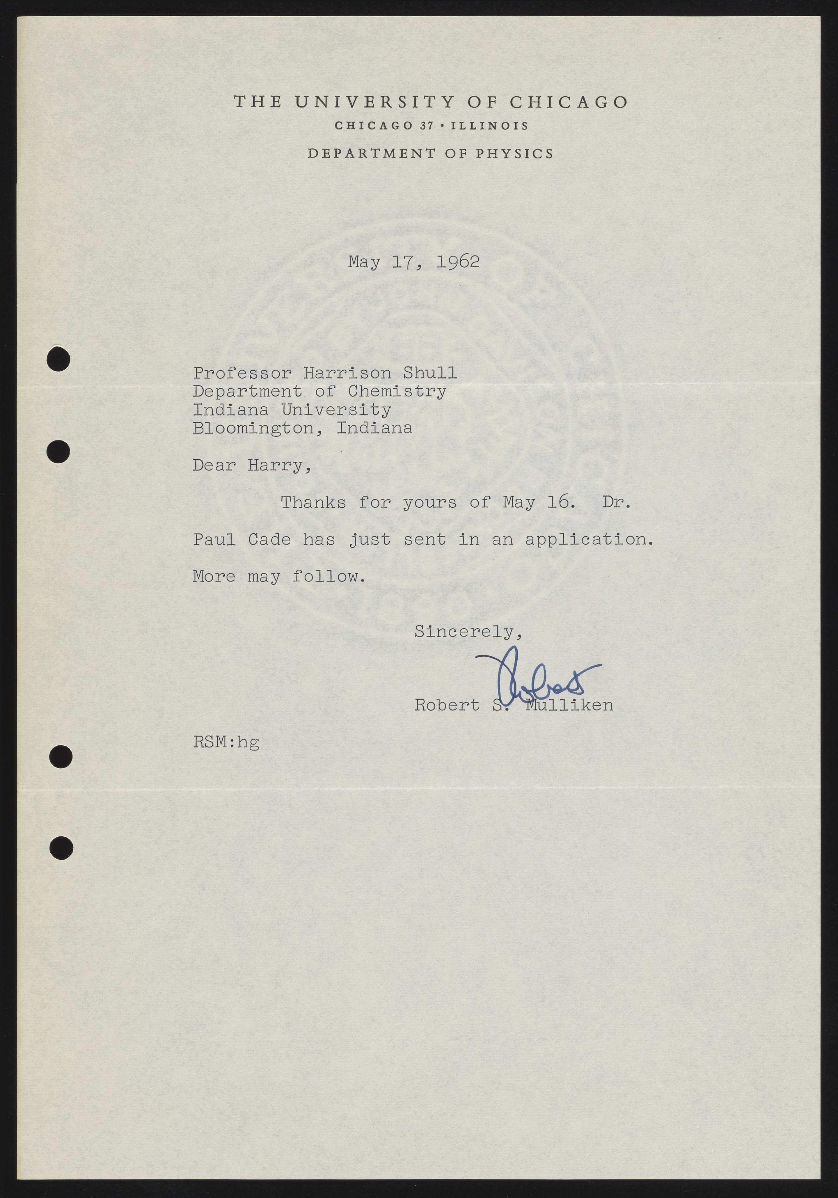 Mulliken, Robert Sanderson. “Letter from Robert S. Mulliken to Harrison Shull, 1962,” May 17, 1962. Robert S. Mulliken & Harrison Shull Correspondence, Box 1. Science History Institute. Philadelphia. https://digital.sciencehistory.org/works/sn009x90d.