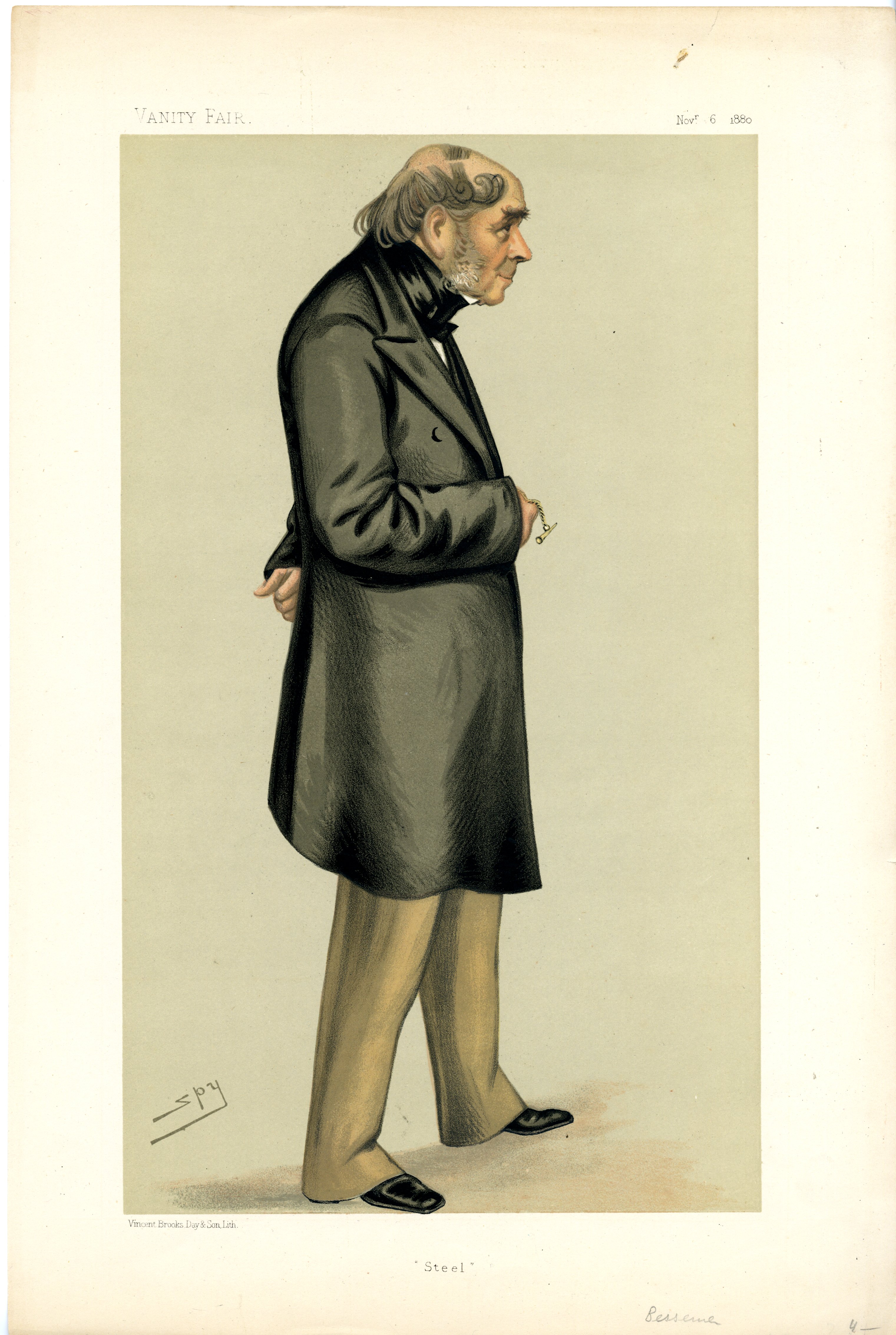 Color lithograph reproduces a watercolor portrait caricature of Sir Henry Bessemer (1813-1898), an English engineer, inventor, and businessman. Bessemer's name is chiefly known in connection with the Bessemer process for the manufacture of steel. Originally published in Vanity Fair on November 6, 1880, Bessemer is shown as a slightly hunched man in a green frock coat, with a pleasant expression.