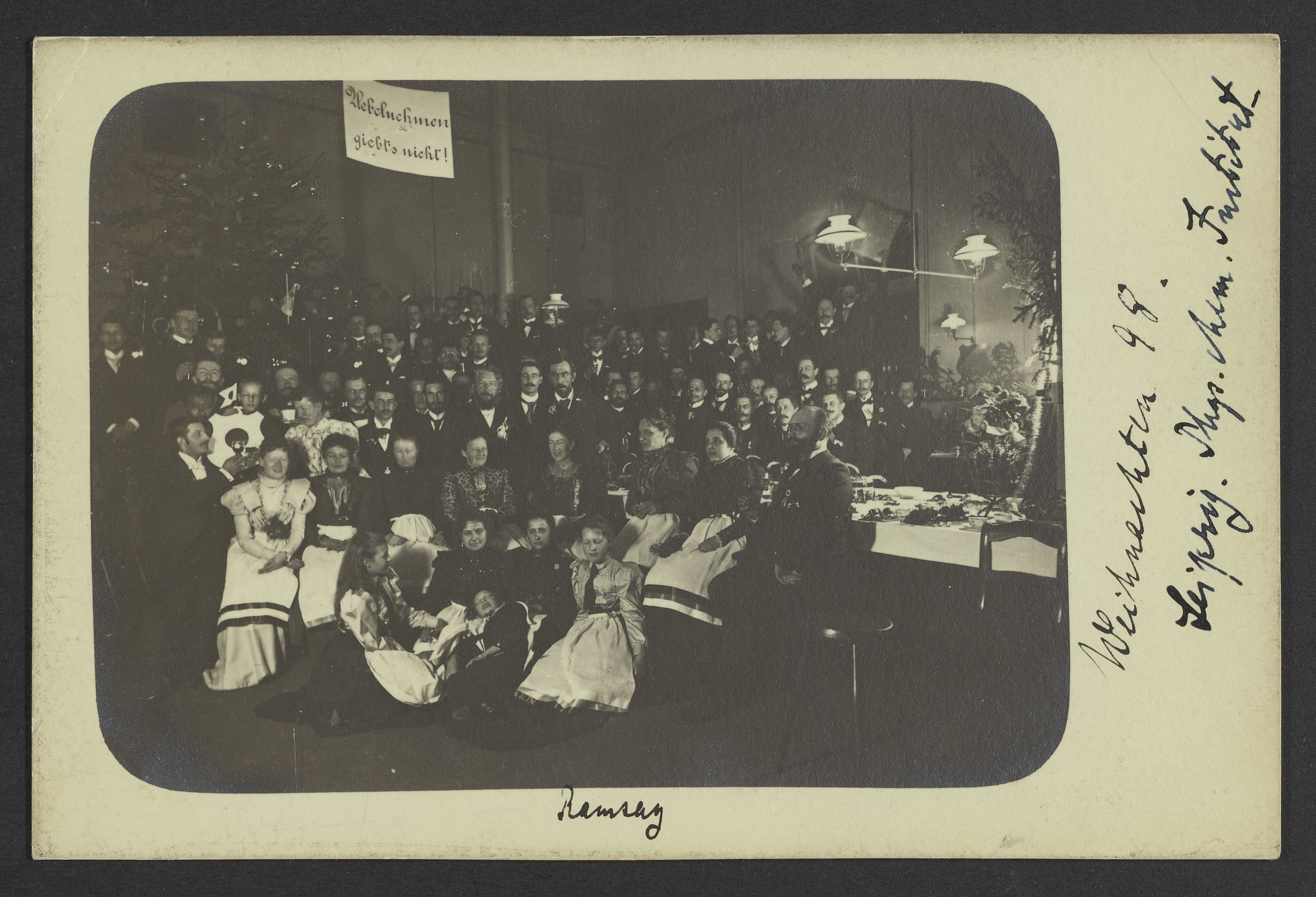 Small JPG1200 x 818px — 156 KBLarge JPG2880 x 1963px — 850 KBFull-sized JPG3506 x 2390px — 1.2 MBOriginal fileTIFF — 3506 x 2390px — 24.0 MBPostcard featuring a group photograph of the 1898 Christmas party at the Physical Chemistry Institute, University of Leipzig.