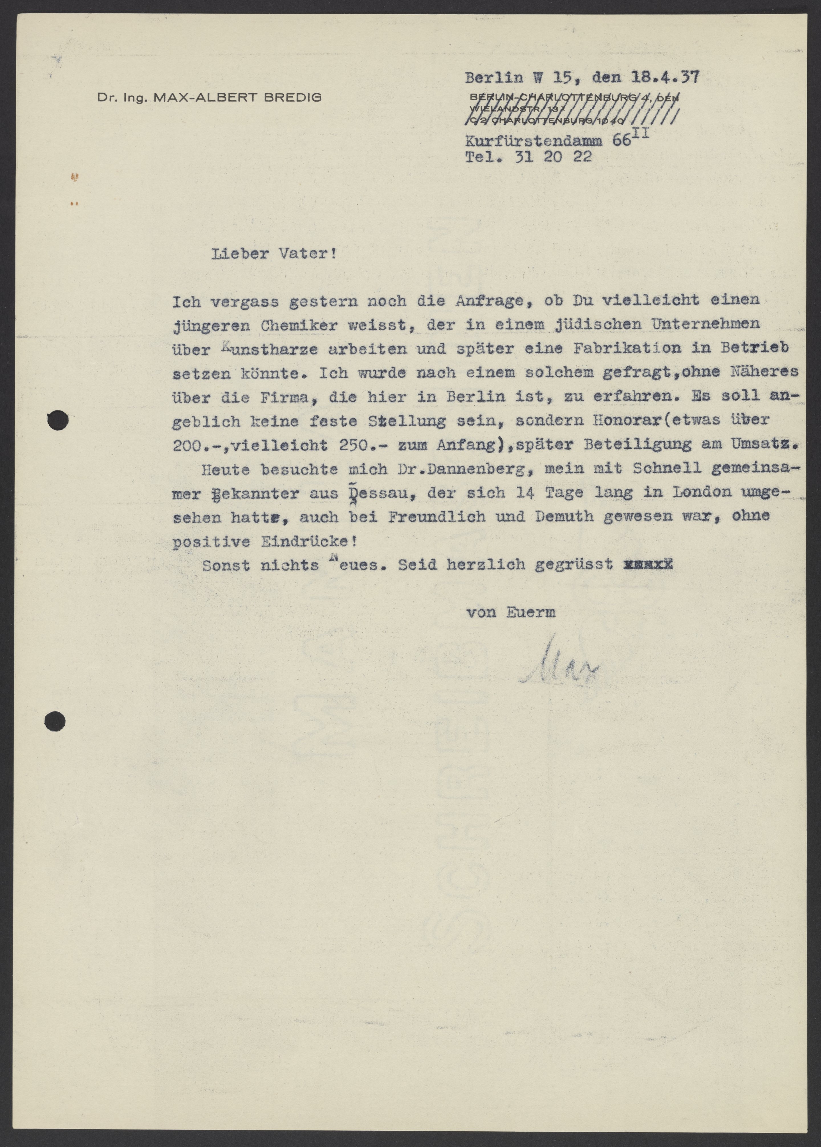 Letter from Max Bredig to Georg Bredig, April 18, 1937