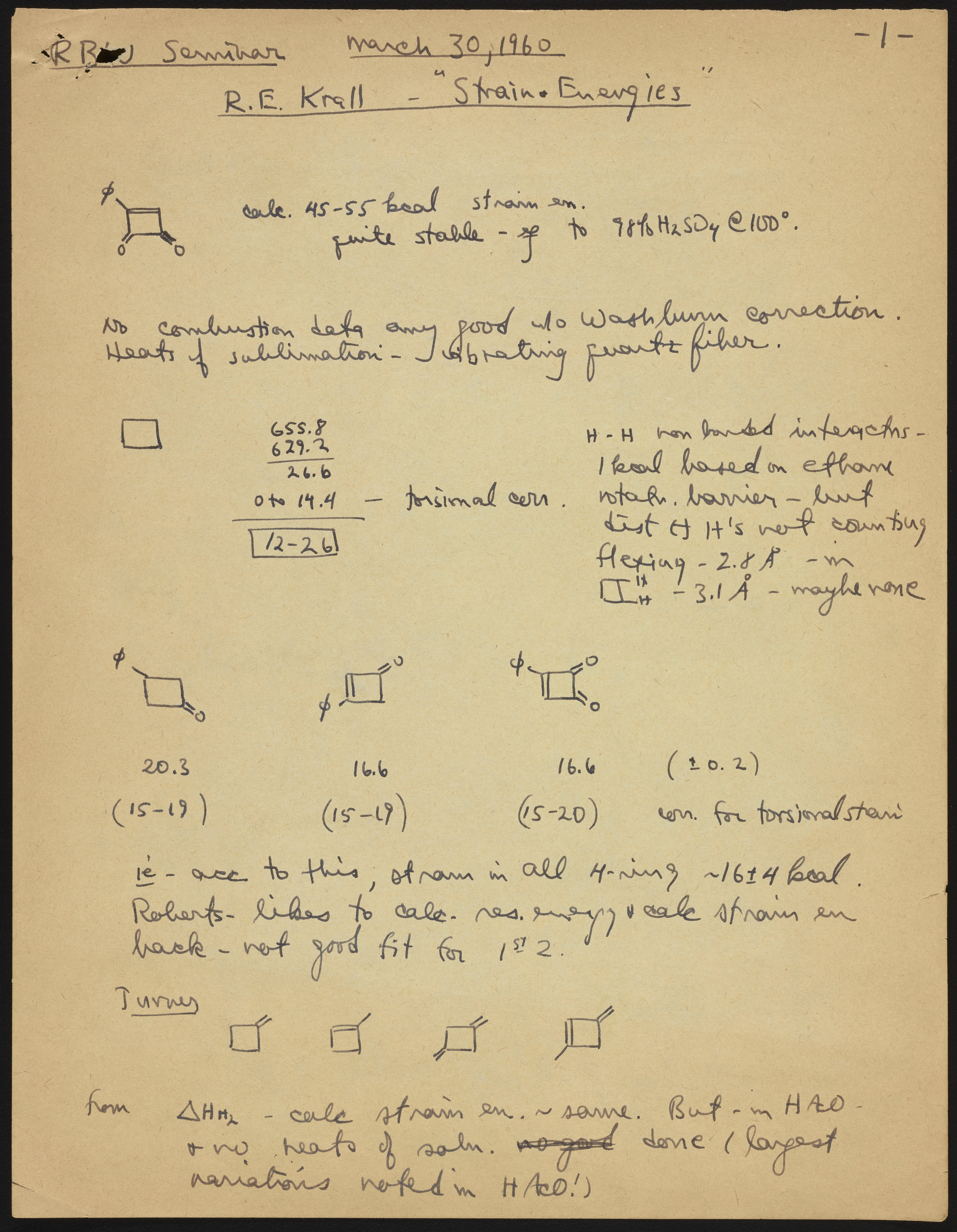 Kohler, Robert E. “R. B. (Robert Burns) Woodward Seminar Entitled ‘Strain Energies.’” Notes from R. B. (Robert Burns) Woodward's Seminars, circa 1959–1966. Folder 2. Science History Institute. Philadelphia. https://digital.sciencehistory.org/works/sq87bv68k.