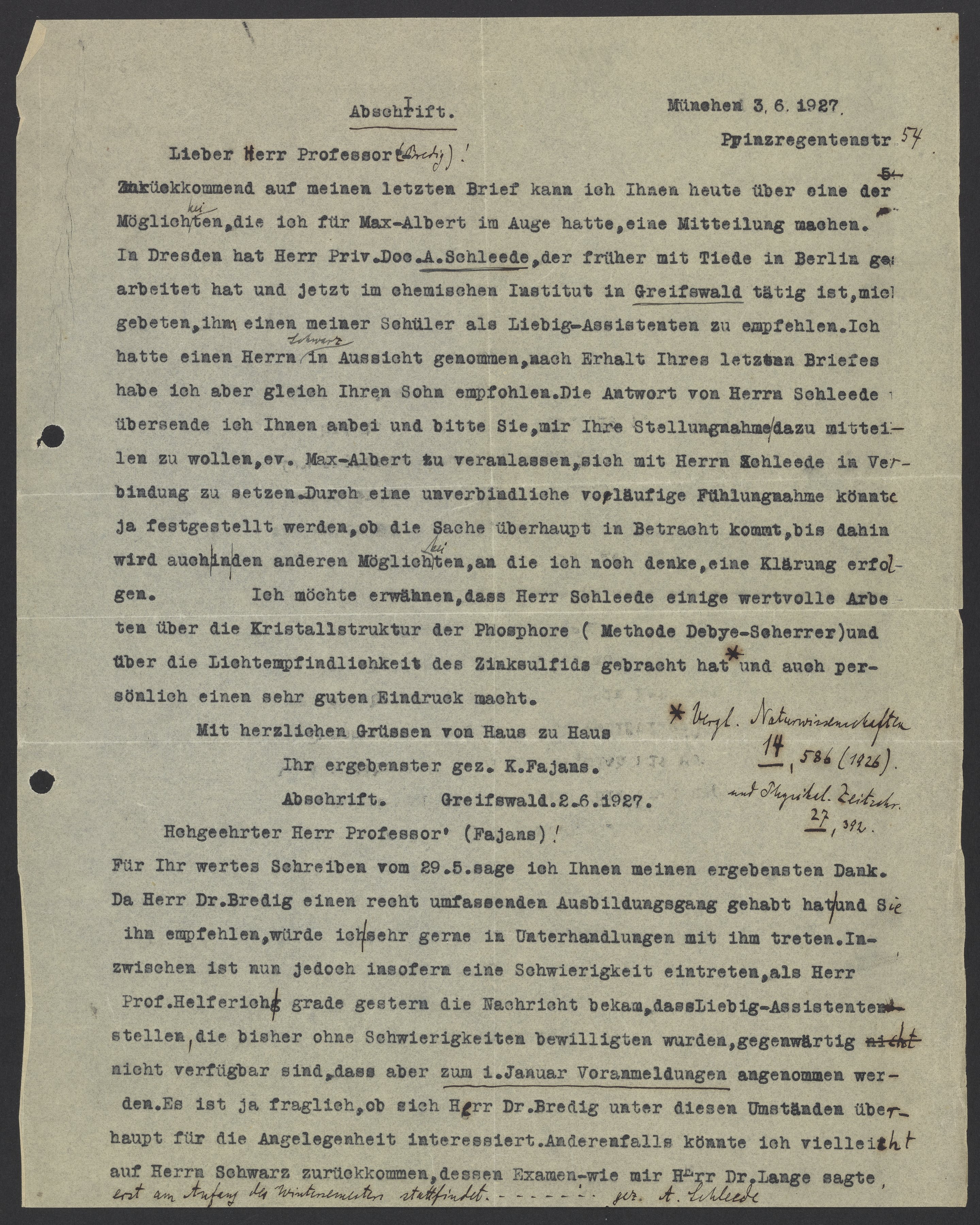 Zurückkommend auf meinem letzten Brief kann ich Ihnen heute über eine der Möglichkeiten, die ich für Max-Albert im Auge hatte, eine Mitteilung machen. In Dresden hat Herr Priv. Doc., A. Schleede, der früher mit Tiede in Berlin gearbeitet hat und jetzt im chemischen Institut in Greifwald tätig ist, mich gebeten, ihm einen meiner Schüler als Liebig-Assistenten zu empfehlen. Ich hatte einen Herrn in Aussicht genommen, macht Erhalt Ihres letzten Briefes habe ich aber gleich Ihren Sohn empfohlen. Die Antwort von Herrn Schleede übersende ich Ihnen anbei und bitte Sie, mir Ihre Stellungnahme dazu mitteilen zu wollen, ev. Max-Albert zu veranlassen, sich mit Herrn Schleede in Verbindung zu setzen. Durch eine unverbindliche vorläufige Fühlungnahme könnte ja festgestellt werden, ob die Sache überhaupt in Betracht kommt, bis dahin wird auch in den anderen Möglichkeiten, an die ich noch denke, eine Klärung erfolgen. Ich möchte erwähnen, dass Herr Schleede einige wertvolle Arbeiten über die Kristallstruktur der Phosphore (Methode Debye-Scherrer) und über die Lichtempfindlichkeit des Zinksulfids gebracht hat* und auch persönlich einen sehr guten Eindruck macht.