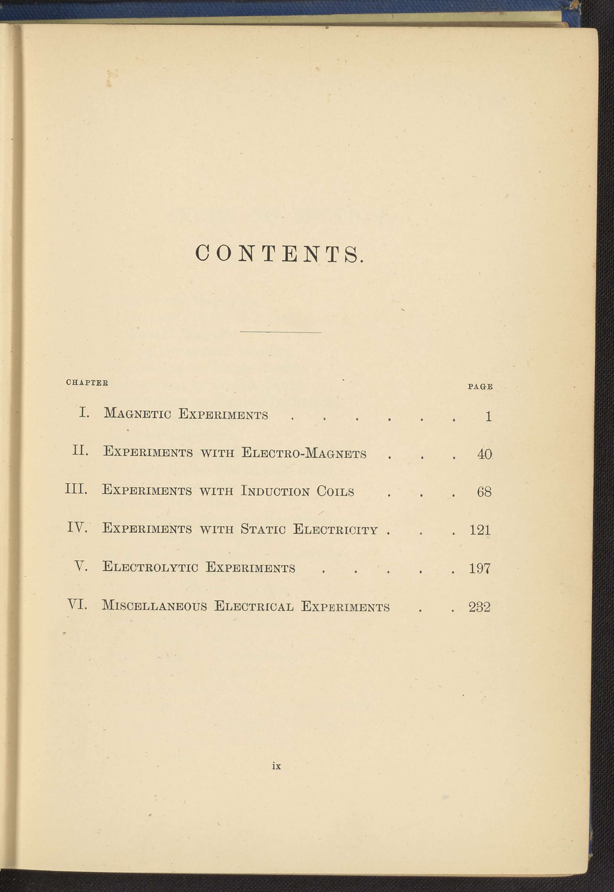Small JPG1200 x 1571px — 494 KBFull-sized JPG2284 x 2991px — 1.5 MBOriginal fileTIFF — 2284 x 2991px — 19.6 MBWritten to show how electrical apparatus can be assembled at little cost for engaging instruction of scientifically-curious youth, this work includes descriptions of simple experiments that demonstrate elementary concepts of magnetism and electricity. Work is thoroughly illustrated and digitized in its entirety.