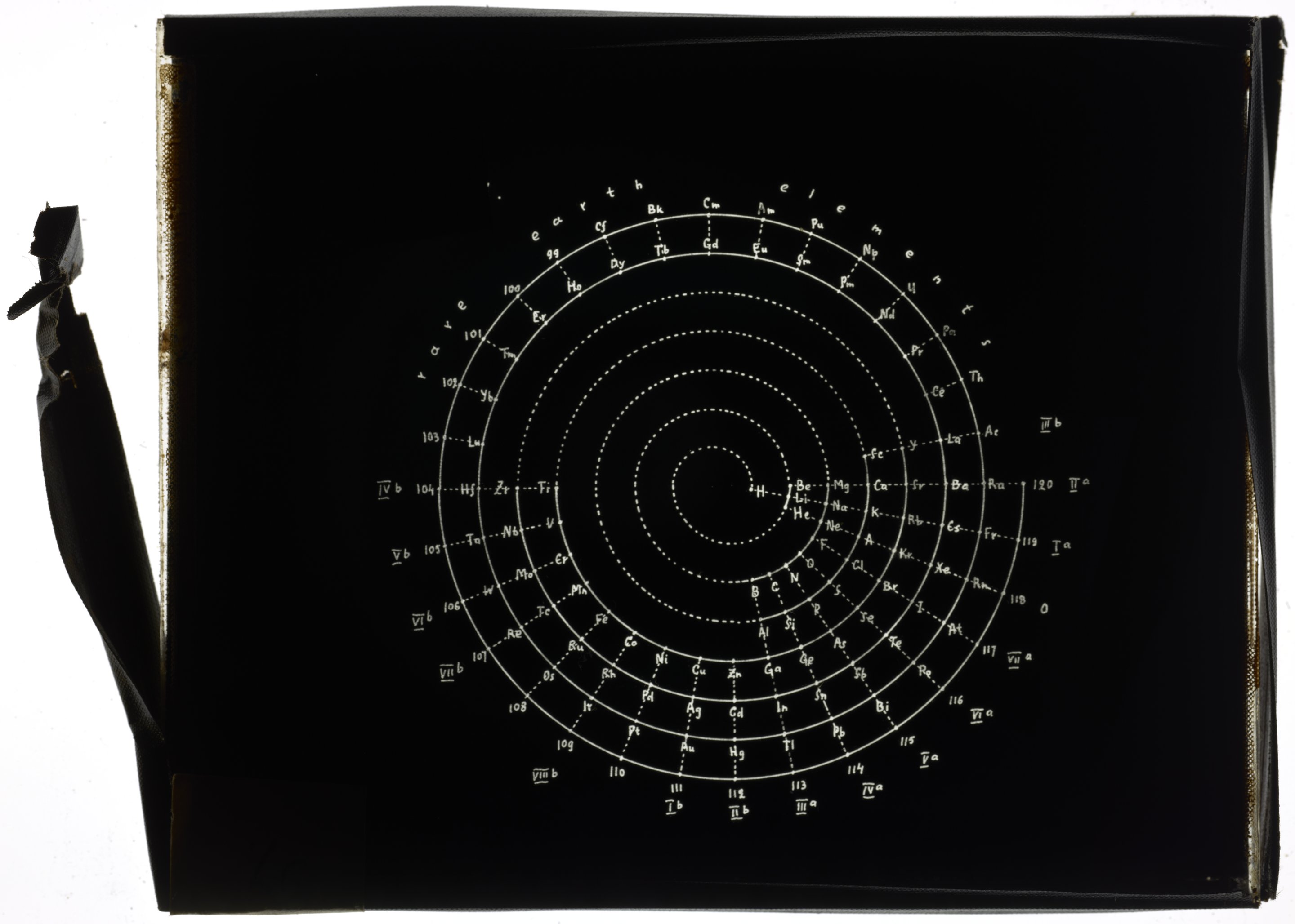 Janet, Charles, and Edward G. Mazurs. “Periodic Table in Style of Spiral with Interrupted Short and Medium Periods.” Glass (material), circa 1928–1957. Edward G. Mazurs Collection of Periodic Systems Images, Box 1. Science History Institute. Philadelphia. https://digital.sciencehistory.org/works/st74cq96s.