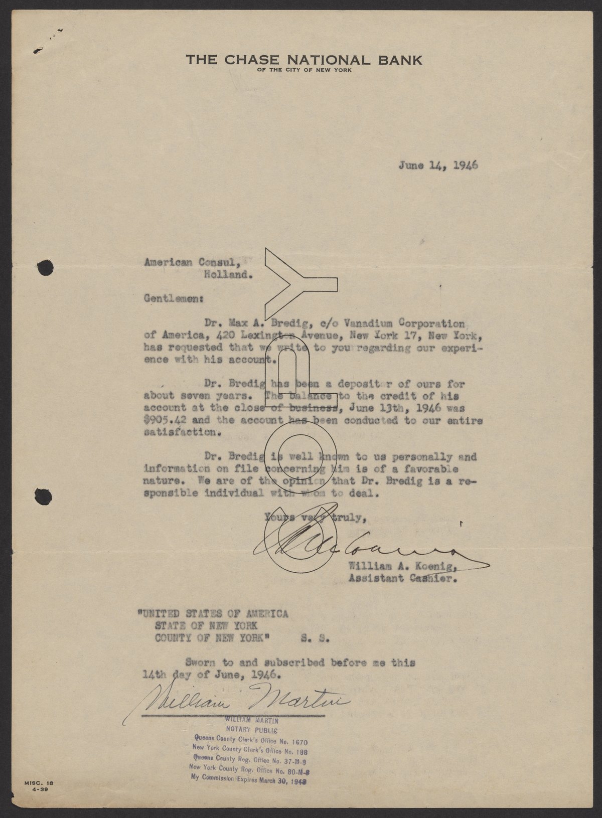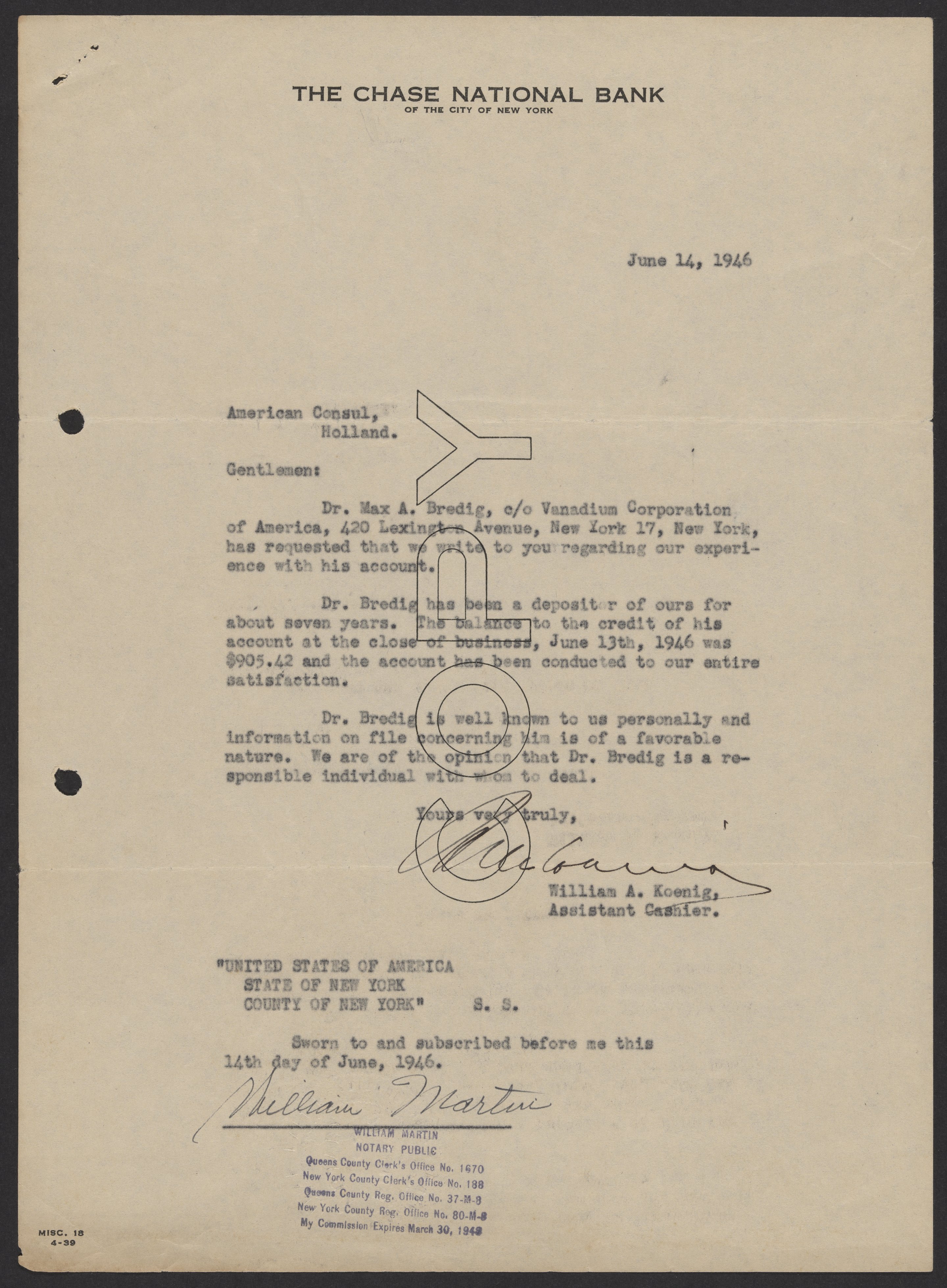 Letter from William A. Koenig to The American Consul General, June 14, 1946