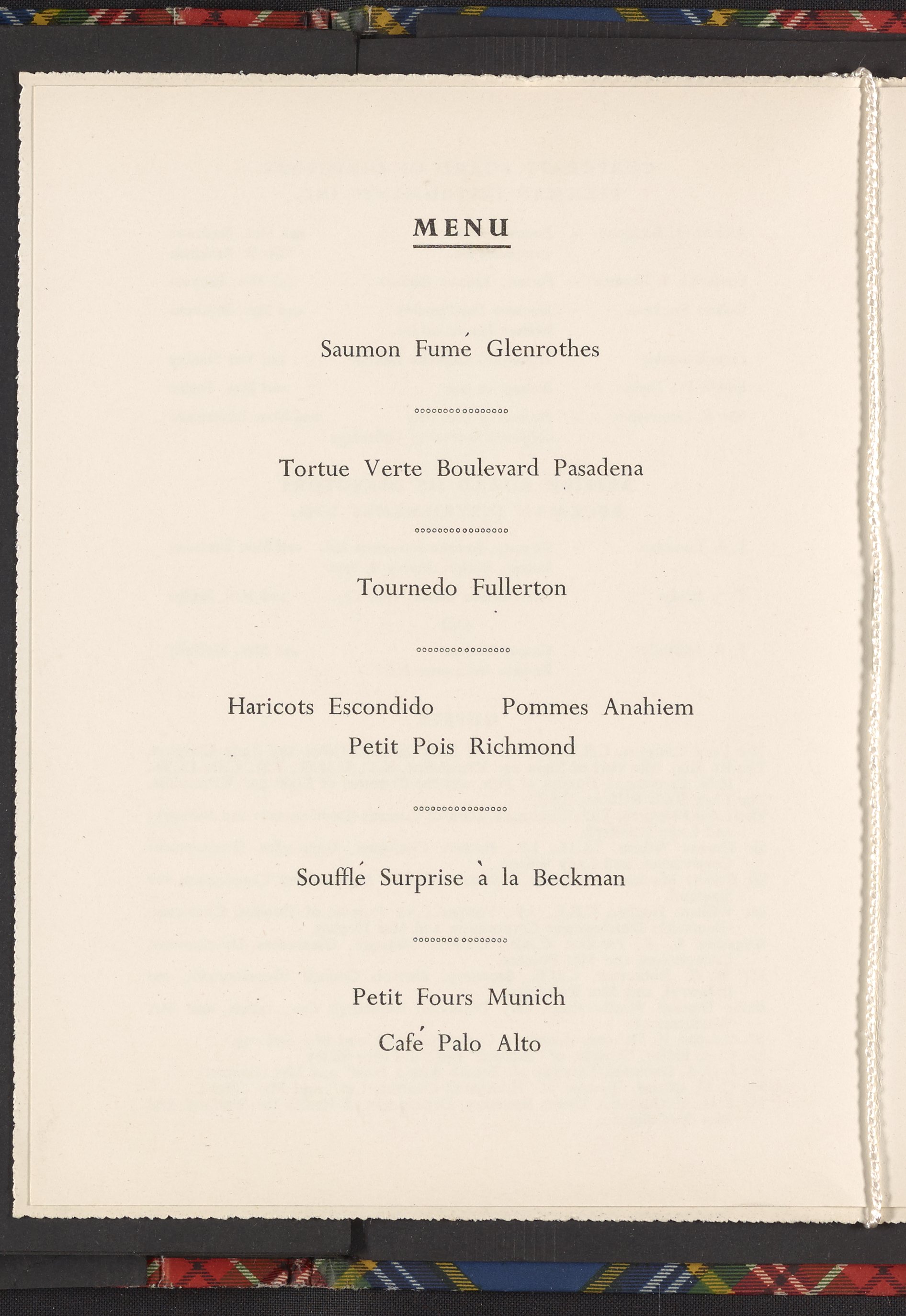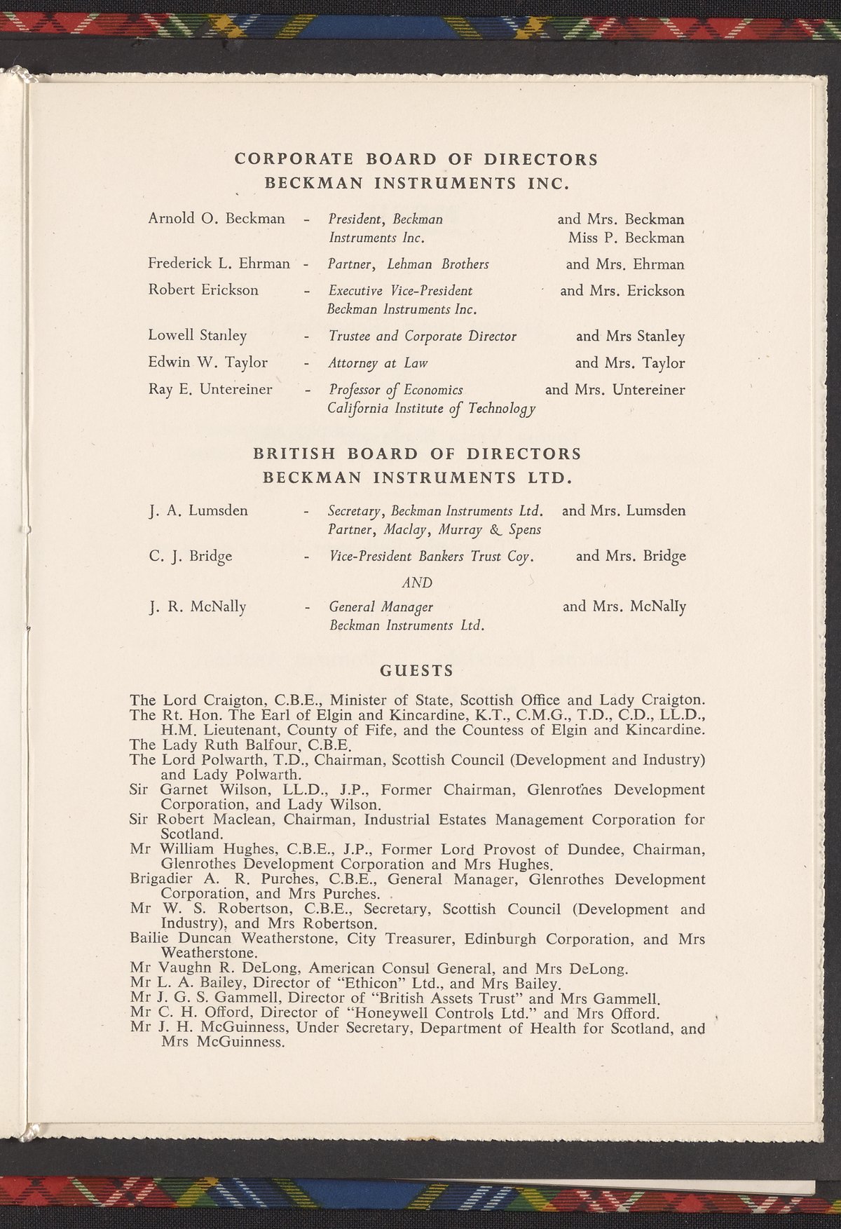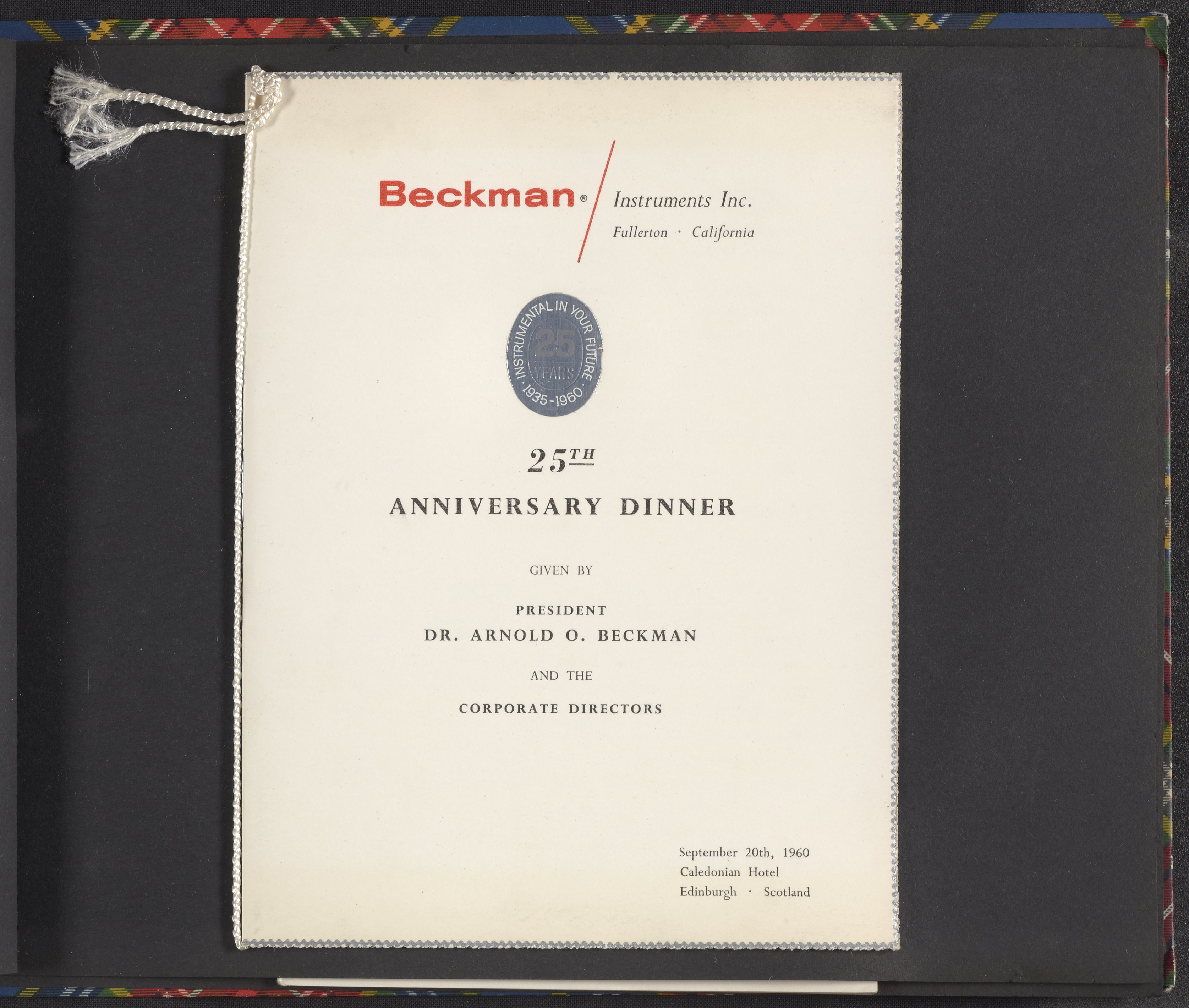 Small JPG1200 x 1017px — 139 KBLarge JPG2880 x 2442px — 760 KBFull-sized JPG3350 x 2840px — 991 KBOriginal fileTIFF — 3350 x 2840px — 27.3 MBAn invitation to an anniversary dinner held on September 20, 1960 at the Caledonian Hotel in Edinburgh. In addition to a menu (featuring such delicacies as Tortue Verte Boulevard Pasadena and Soufflé Surprise à la Beckman) and list of toasts, the invitation includes a list of the Corporate Board of Directors of Beckman Instruments, Inc., the British Board of Directors of Beckman Instruments, Ltd., and a guest list.