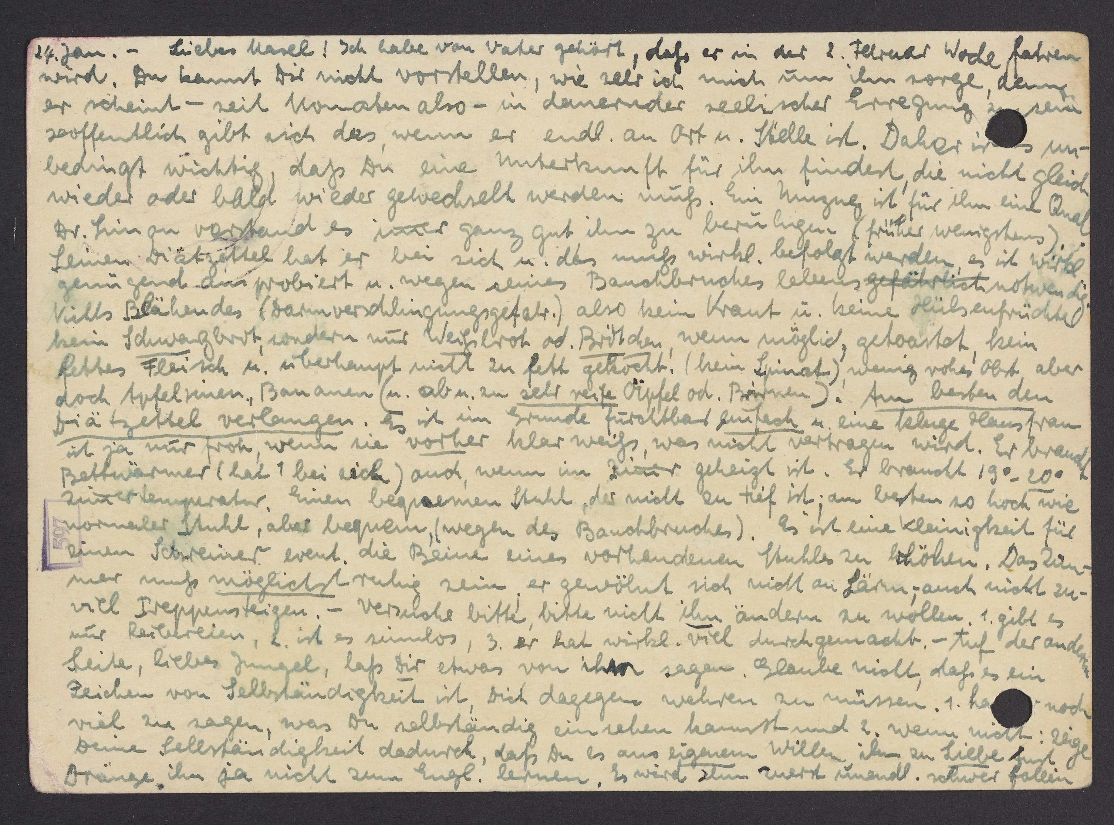 Liebes Maxel! Ich habe von Vater gehört, dass er in der 2. Februar Woche fahren wird. Du kannst Dir nicht vorstellen wie sehr ich mich um ihn sorge, denn er scheint – seit Wochen also – in dauernder seelischer Erregung zu sein. Hoffentlich gibt sich das, wenn er endlich am Ort u. Stelle ist. Daher ist es unbedingt wichtig, daß Du eine Unterkunft für ihn findest, die nicht gleich wieder oder bald wieder gewechselt werden muß. Ein Umzug ist für ihn eine Qual. Dr. Simon verstand es immer ganz gut ihn zu beruhigen (früher wenigstens). Seinen Diätzettel hat er bei sich u. das muß wirklich befolgt werden, es ist wirklich genügend ausprobiert u. wegen seines Bauchbruches lebensnotwendig.. Nichts Blähendes (Darmverschlingungsgefaehr) also kein Kraut u. keine Hülsenfrüchte, kein Schwarzbrot, sondern nur Weißbrot oder Brötchen, wenn möglich, getoastet, kein fettes Fleisch u. ueberhaupt nicht zu fett gekocht! Kein Spinat, wenig rohes Obst aber doch Apfelsinen, Bananen (u. ab u. zu sehr reife Äpfel od. Birnen). Am besten den Diätzettel verlangen. Es ist im Grunde furchtbar einfach u. eine kluge Hausfrau ist ja nur froh, wenn sie vorher klar weiß, was nicht vertragen wird. Er braucht Bettwärmer (hat 1 bei sich) auch, wenn ein Zimmer geheizt ist. Er braucht 19-20 Grad Zimmertemperatur, einen bequemen Stuhl, der nicht zu tief ist; am best so hoch wie normaler Stuhl, aber bequem (wegen des Bauchbruches). Es ist eine Kleinigkeit fuer einen Schreiner event. die Beine eines vorhandenen Stuhles zu behöhen. Das Zimmer muss möglichst ruhig sein. Er gewöhnt sich nicht an Lärm, auch nicht zu viel Treppensteigen. – Versuche bitte, bitte nicht ihm ändern zu wollen. 1. gibt es nur Reibereien, 2. ist es sinnlos, 3. er hat wirklich viel durchgemacht. Auf der anderen Seite, liebes Jungen, laß Dir etwas von ihm sagen. Glaube nicht, daß es ein Zeichen von Selbständigkeit ist, Dich dagegen wehren zu müssen. Ich habe noch viel zu sagen, was Du selbstständig einsehen kannst und 2. wenn nicht: zeige Deine Selbstfähigkeit dadurch, daß es auch eigenem Willen ihm zu Liebe tust. Dränge ihn ja nicht zum Englisch lernen. Es wird ihm schon zuerst unendlich schwer fallen