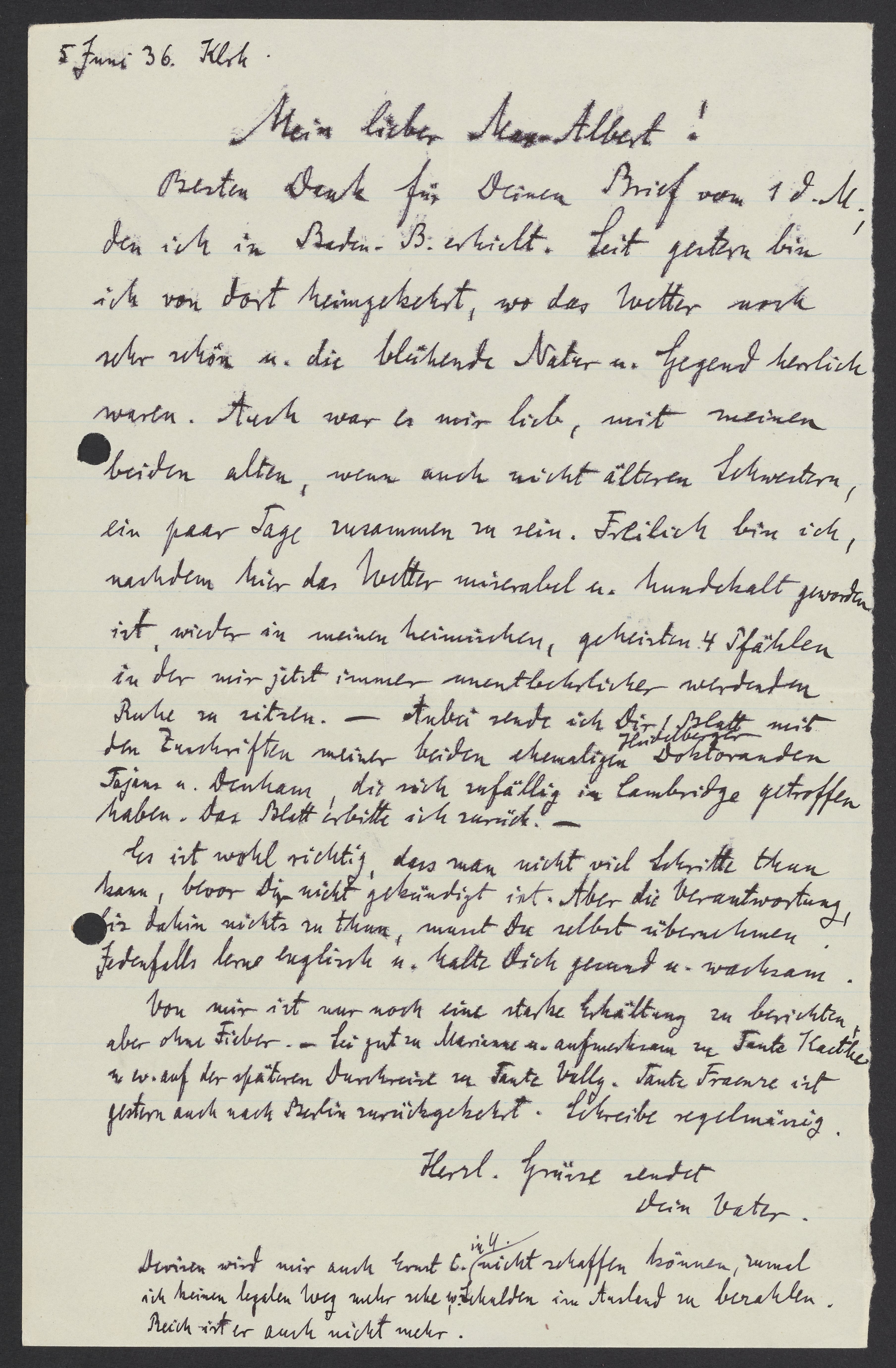 Von mir ist nur noch eine starke Erklältung zu berichten, aber ohne Fieber. Sei gut zu Marianne u. aufmerksam zu Tante Kaethe u w. auf der spätern Durchreise zu Tante Vally. Tante Fraenze ist gestern auch nach Berlin zurückgekehrt. Schreibe regelmässig.