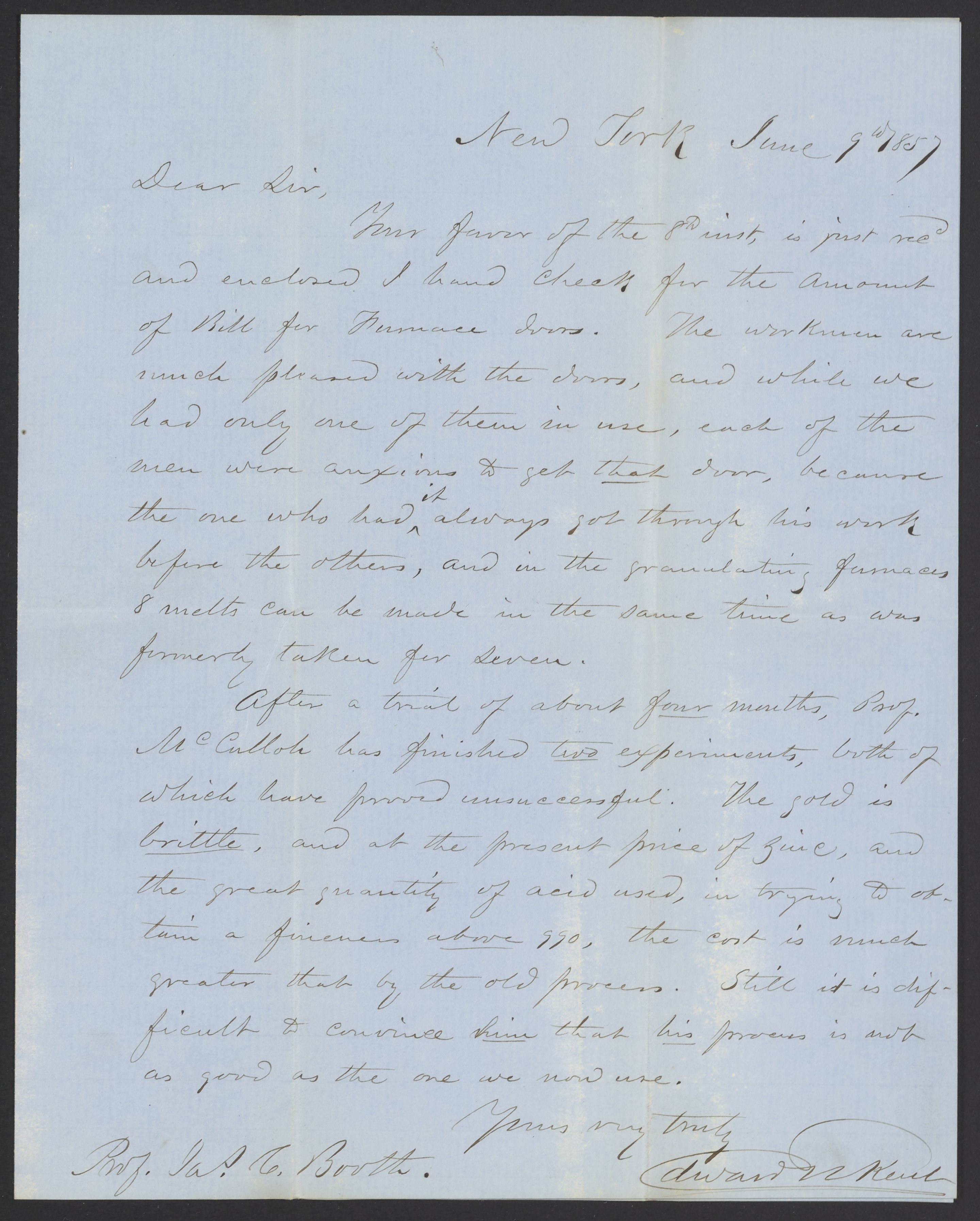 Letter from Edward N. Kent to James Curtis Booth, June 9, 1857