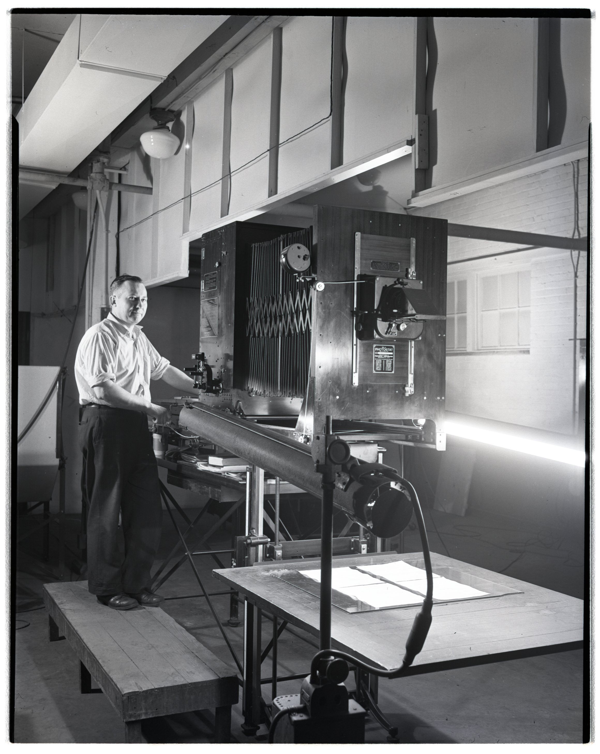 Dow Chemical Company. “Russ Johnson Operating Photostat Machine in Dow Photographic Laboratory,” January 13, 1947. Dow Chemical Company Historical Image Collection, Box 3, Folder Places--Dow Photographic Dept. Science History Institute. Philadelphia. https://digital.sciencehistory.org/works/t722h923j.