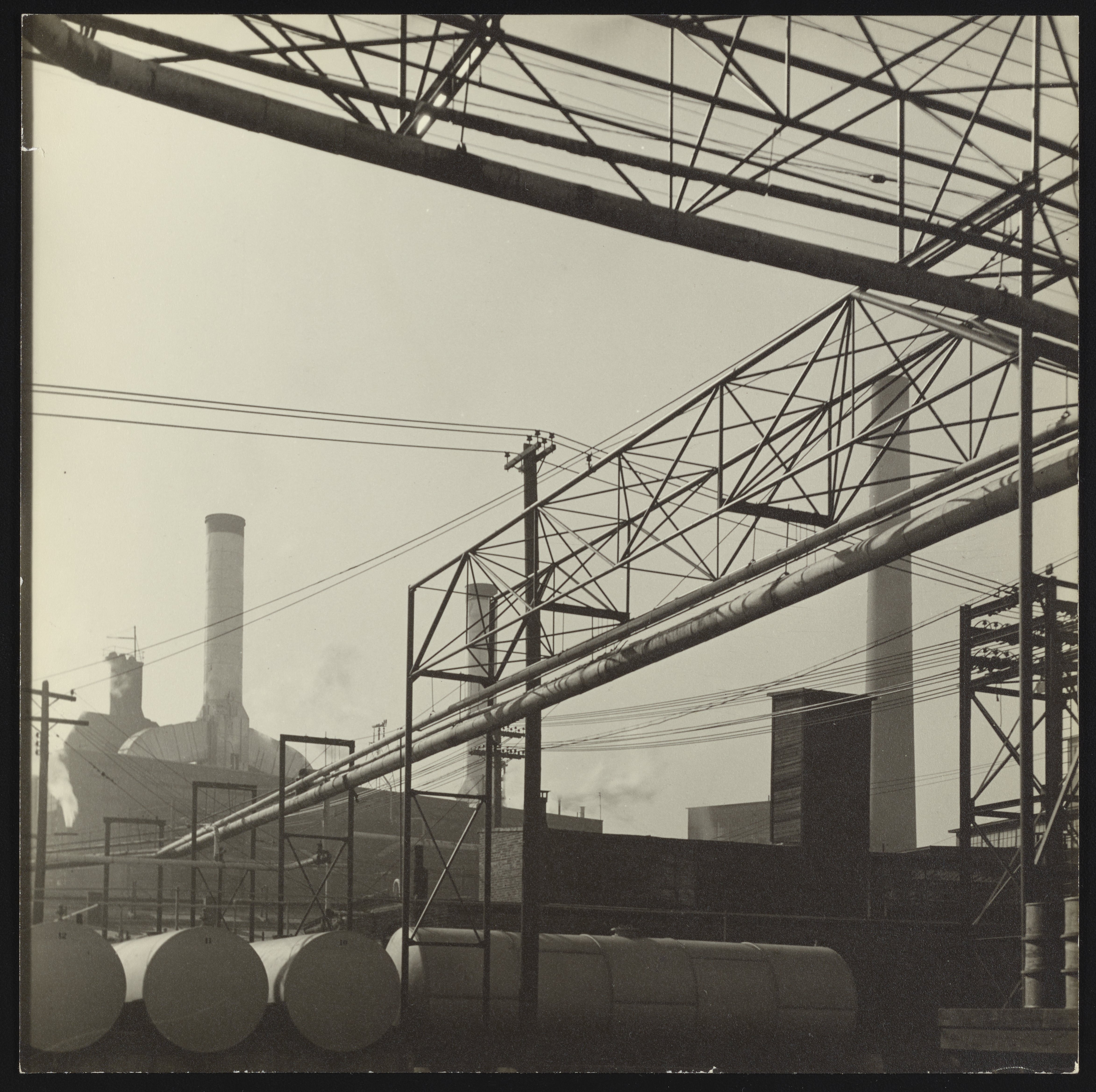 General view of a section of the exterior of the Cliffs Dow wood distillation plant located in Marquette, Michigan. Seeking a source of raw material for its new plastic, ethylcellulose, the Dow Chemical Company joined with the Cleveland-Cliffs Iron Company to form the Cliffs Dow Chemical Company in April 1935. The Cliffs Dow plant in Marquette primarily produced charcoal used in the manufacture of pig iron, as well as a range of chemical by-products including acetic acid, calcium acetate, wood alcohol, and ethyl alcohol. Notably, when the Marquette plant ceased operations in 1969, it was the last wood distillation plant in the United States.