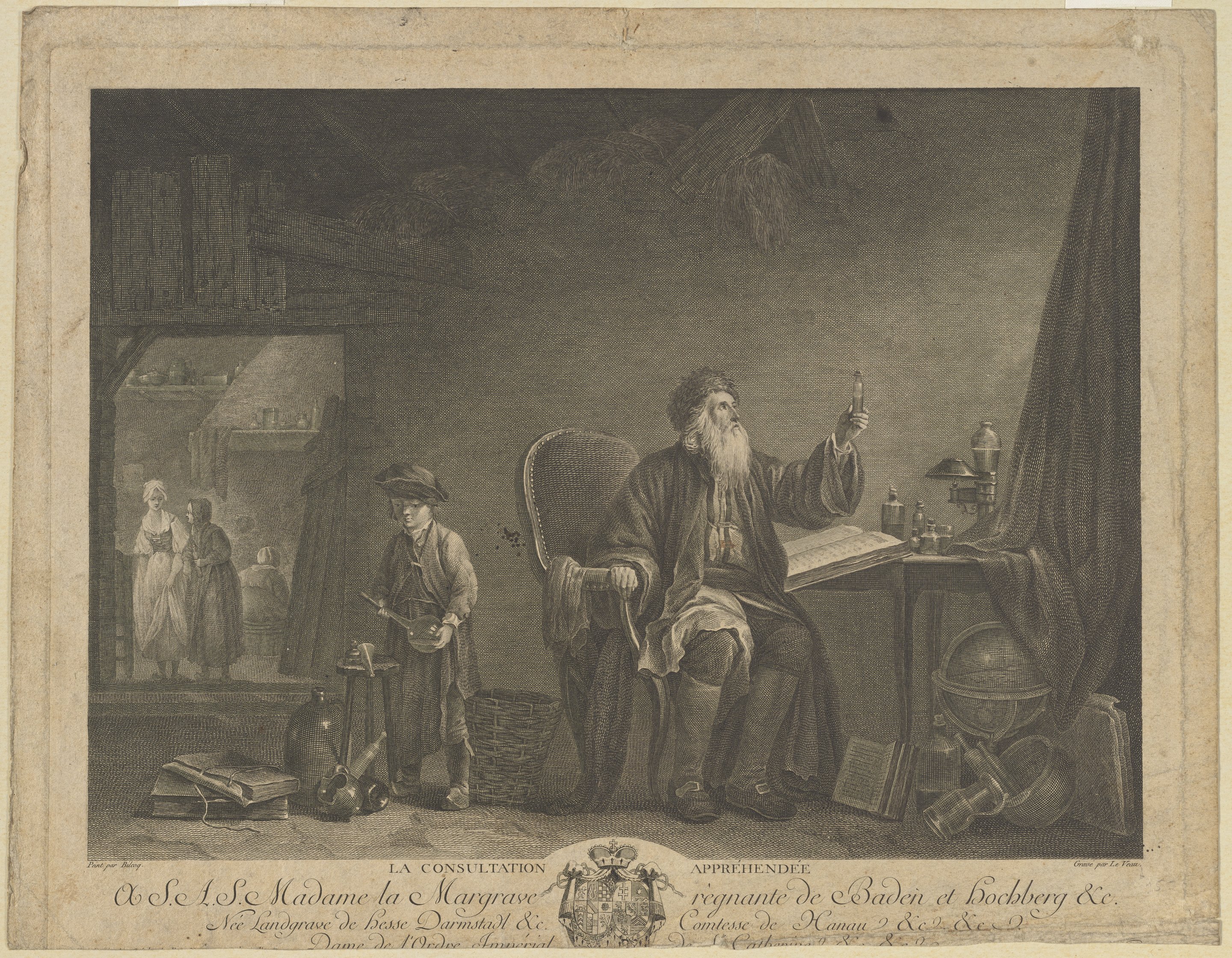 This print, engraved by Jean Jacques Le Veau after a painting by Marie-Marc-Antoine Bilcoq, shows a bearded alchemist examining a flask in the warm light of an unseen window. In a humble chamber behind a wooden doorframe, we see two women waiting for the alchemist's diagnosis. He is likely performing uroscopy, the examination of urine for the diagnosis of disease. The alchemist's young assistant holds a piece of glassware from a nearby distillation apparatus, surrounded by books, papers, and flasks.