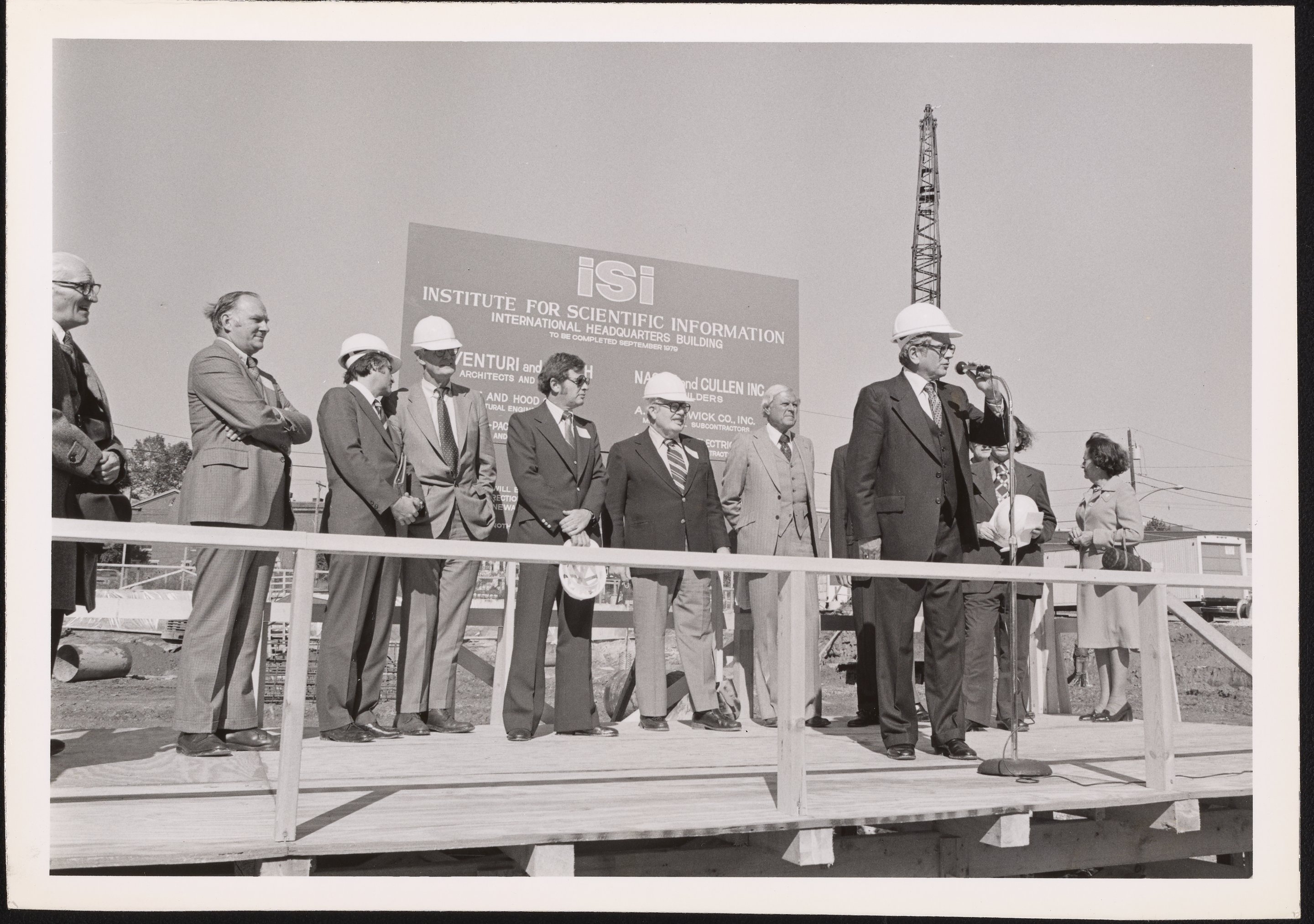 Black and white photograph depicting a speaker and panel at the groundbreaking ceremony for the Institute for Scientific Information (ISI) International Headquarters Building. The ISI was an academic publishing service, founded by Eugene Garfield (1925-2017) in Philadelphia in 1956. ISI offered scientometric and bibliographic database services and specialized in citation indexing and analysis.