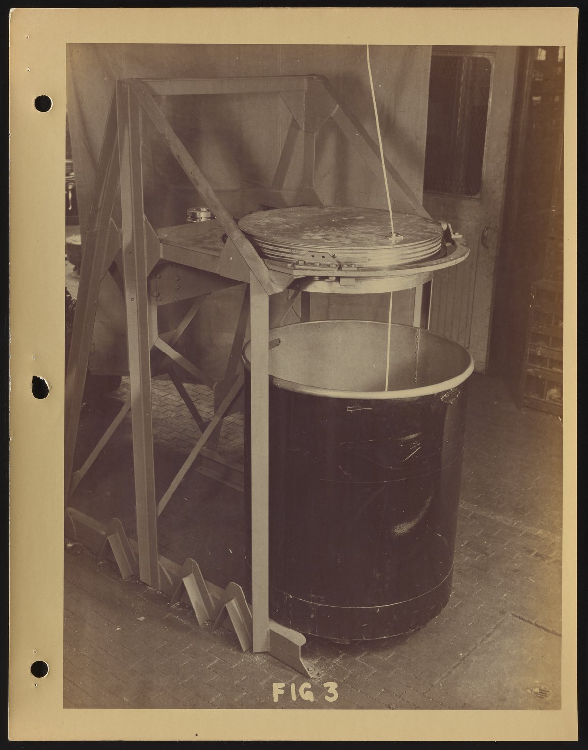 General view of a coiler mechanism used at DuPont during the early stages of synthetic fiber production and research. Typically, this type of apparatus was used to coil tow, an untwisted bundle of continuous filaments, for storage.