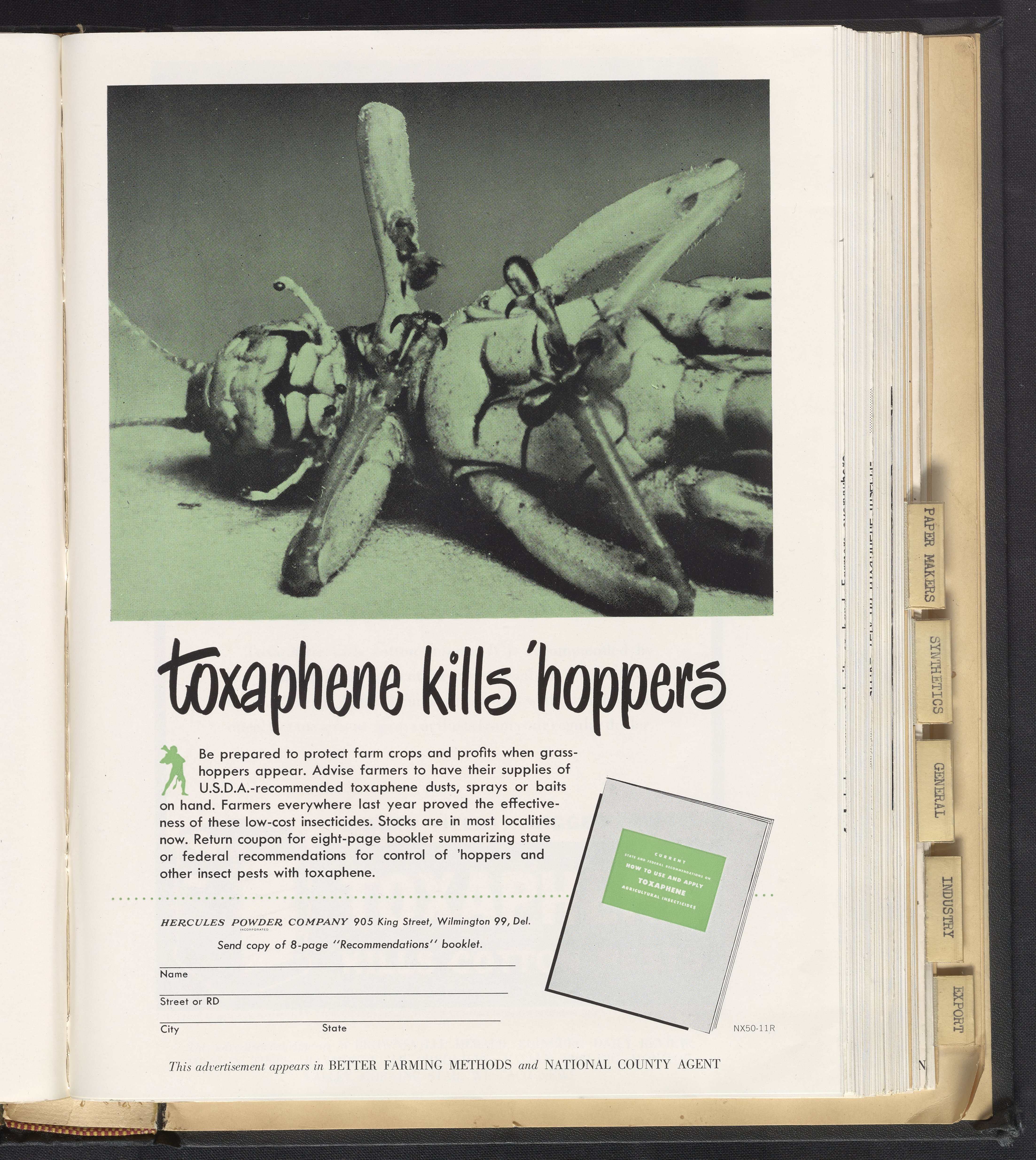 Print advertisement for toxaphene produced by Hercules Powder Company depicts a photograph of a dead grasshopper killed by toxaphene. A paragraph describes how the use of toxaphene will increase yields by killing insect infestations. The bottom of the ad is a tear-away coupon for a booklet entitled Current State and Federal Recommendations on How to Use and Apply Toxaphene Agricultural Insecticides. This advertisement appeared in Better Farming Methods and National County Agent.