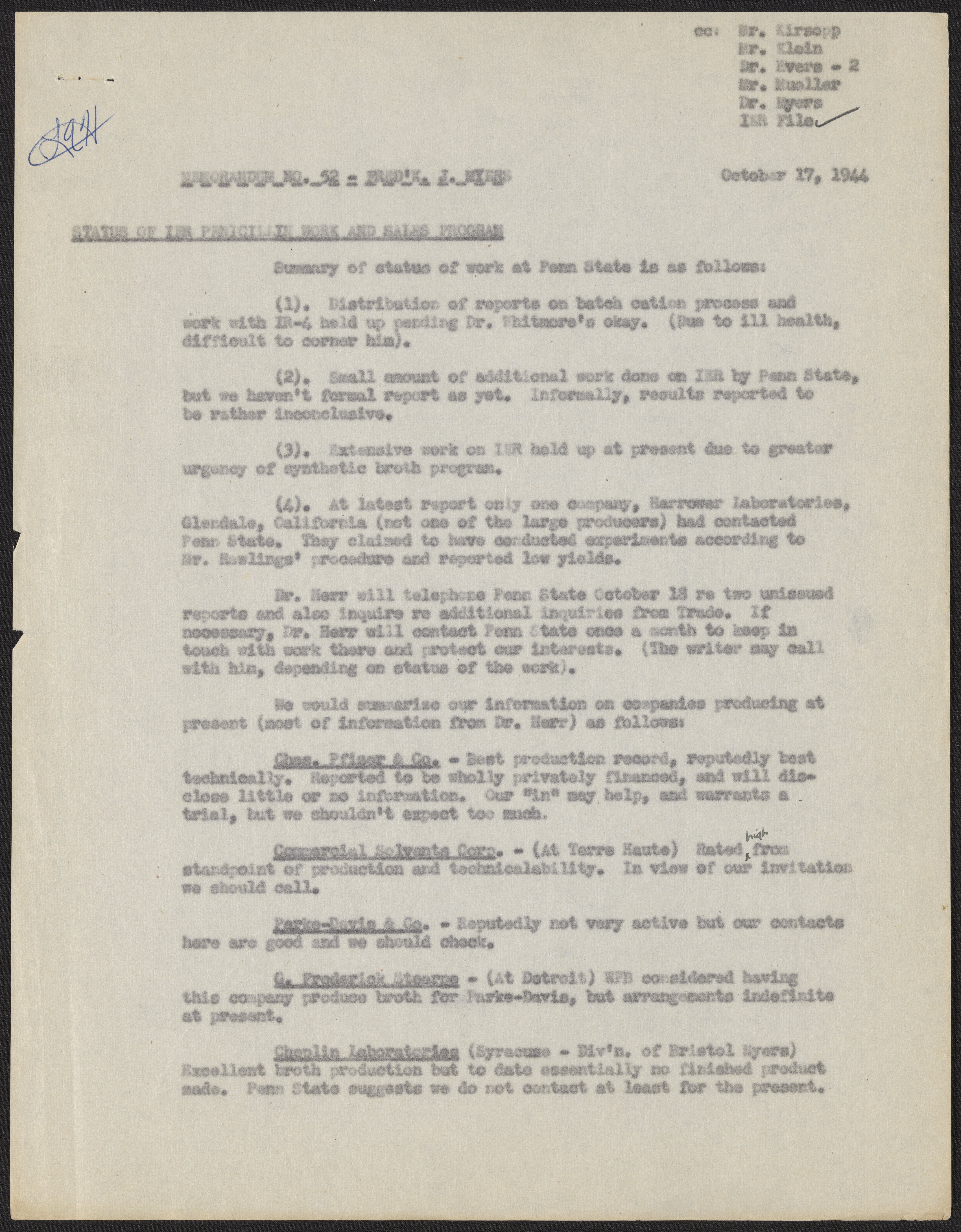 Memorandum No. 52: Status of IER Penicillin Work and Sales Program