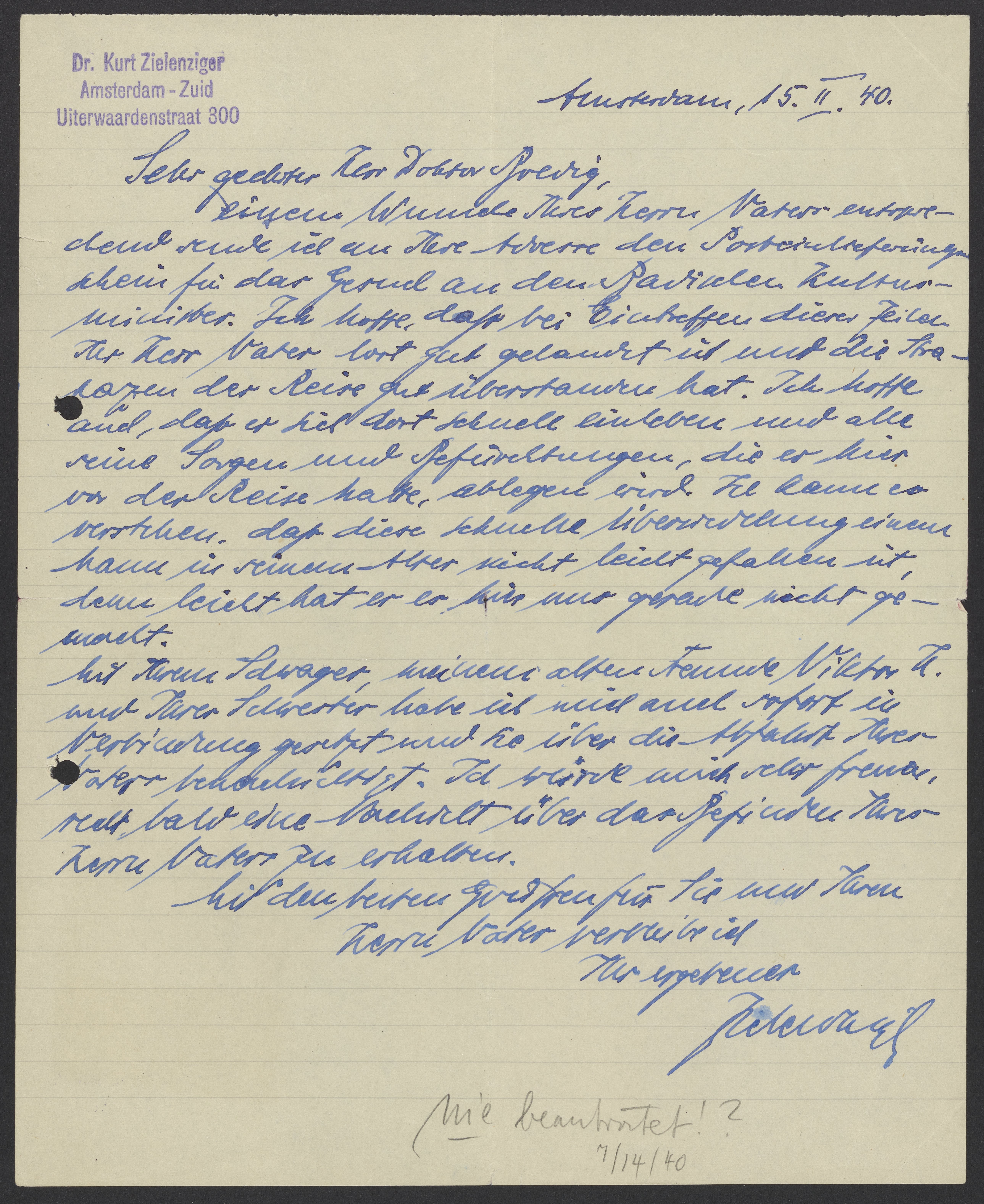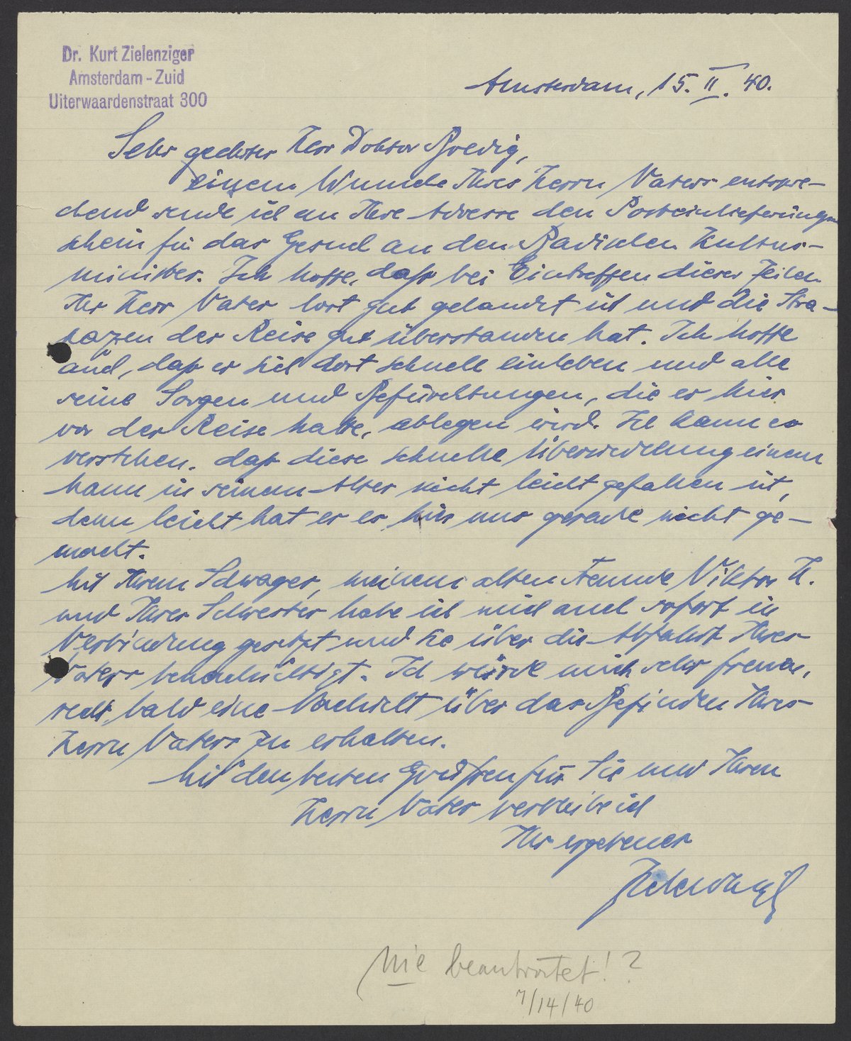 Kurt Zielenziger (1890-1944), a German Jewish journalist and economist living in Amsterdam, sends Max Bredig (1902-1977) correspondence from the Baden Culture Minister regarding his father, Georg Bredig (1868-1944). Zielenziger also inquires about Georg Bredig's well-being after his arduous journey from the Netherlands, where he had sought refuge from the Third Reich, to the U.S.A