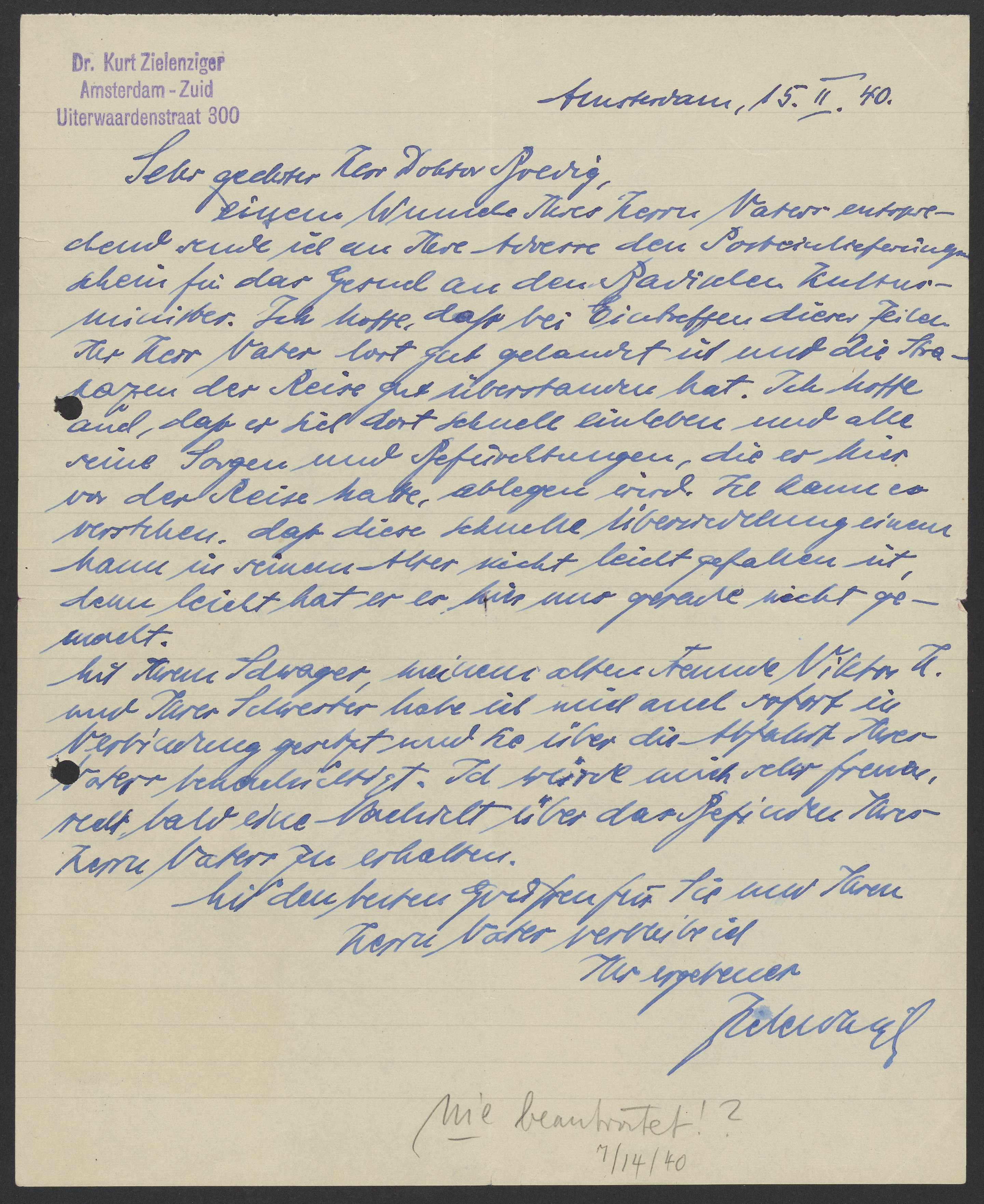 Kurt Zielenziger (1890-1944), a German Jewish journalist and economist living in Amsterdam, sends Max Bredig (1902-1977) correspondence from the Baden Culture Minister regarding his father, Georg Bredig (1868-1944). Zielenziger also inquires about Georg Bredig's well-being after his arduous journey from the Netherlands, where he had sought refuge from the Third Reich, to the U.S.A