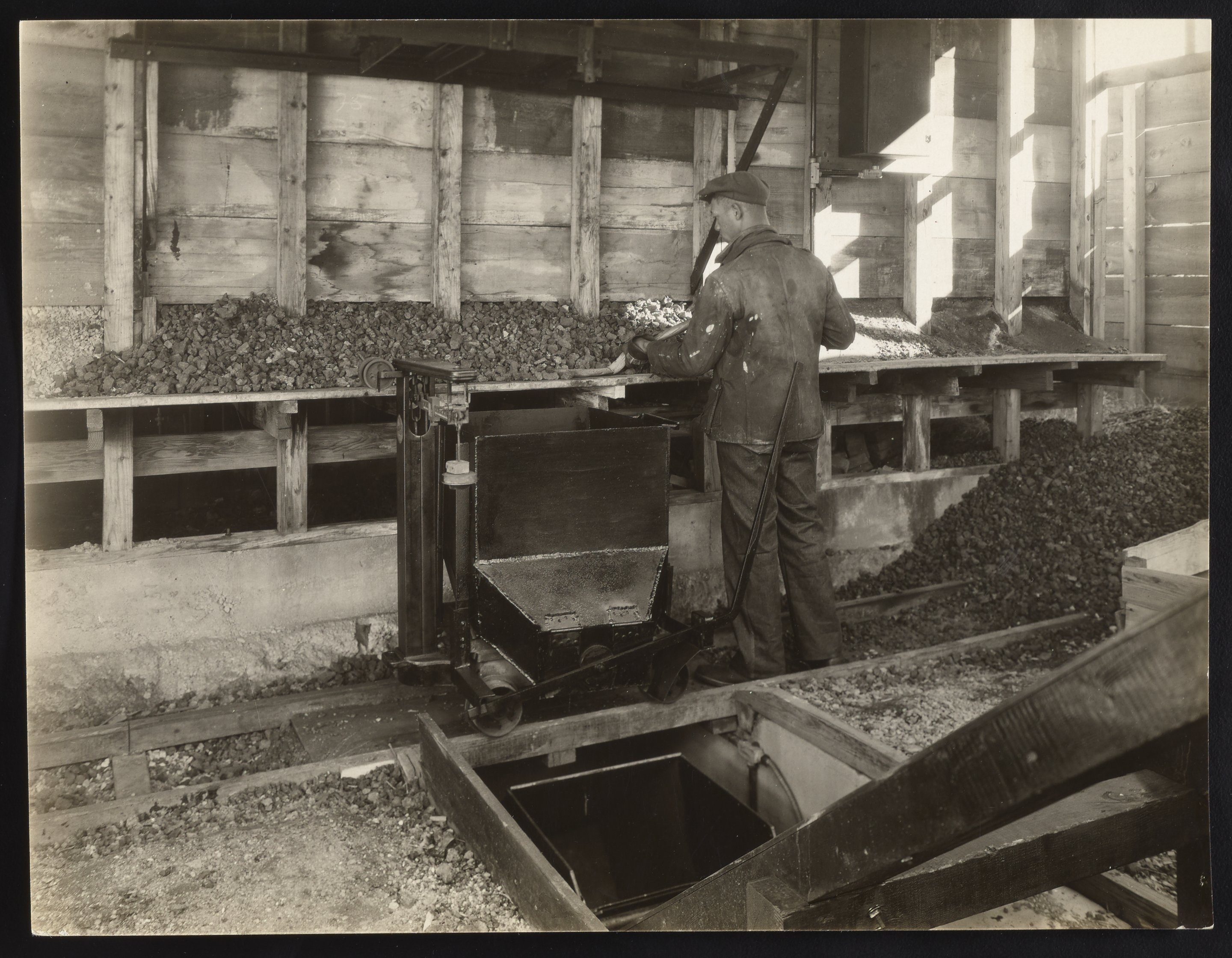 General view of an unidentified worker sorting raw material, possibly ore or phosphate, at a Fixed Nitrogen Research Laboratory plant. The Fixed Nitrogen Research Laboratory (F.N.R.L.) was established at American University in 1919 under the directorship of Arthur B. Lamb. Initially part of the War Department, the F.N.R.L. was the successor to several wartime initiatives to develop a secure domestic supply of nitrate compounds necessary for the manufacture of explosives during World War I. With a staff of about 110 individuals, including 35 to 50 chemists, the F.N.R.L. focused on the manufacture, production, and development of products of atmospheric nitrogen, including munitions and fertilizers.