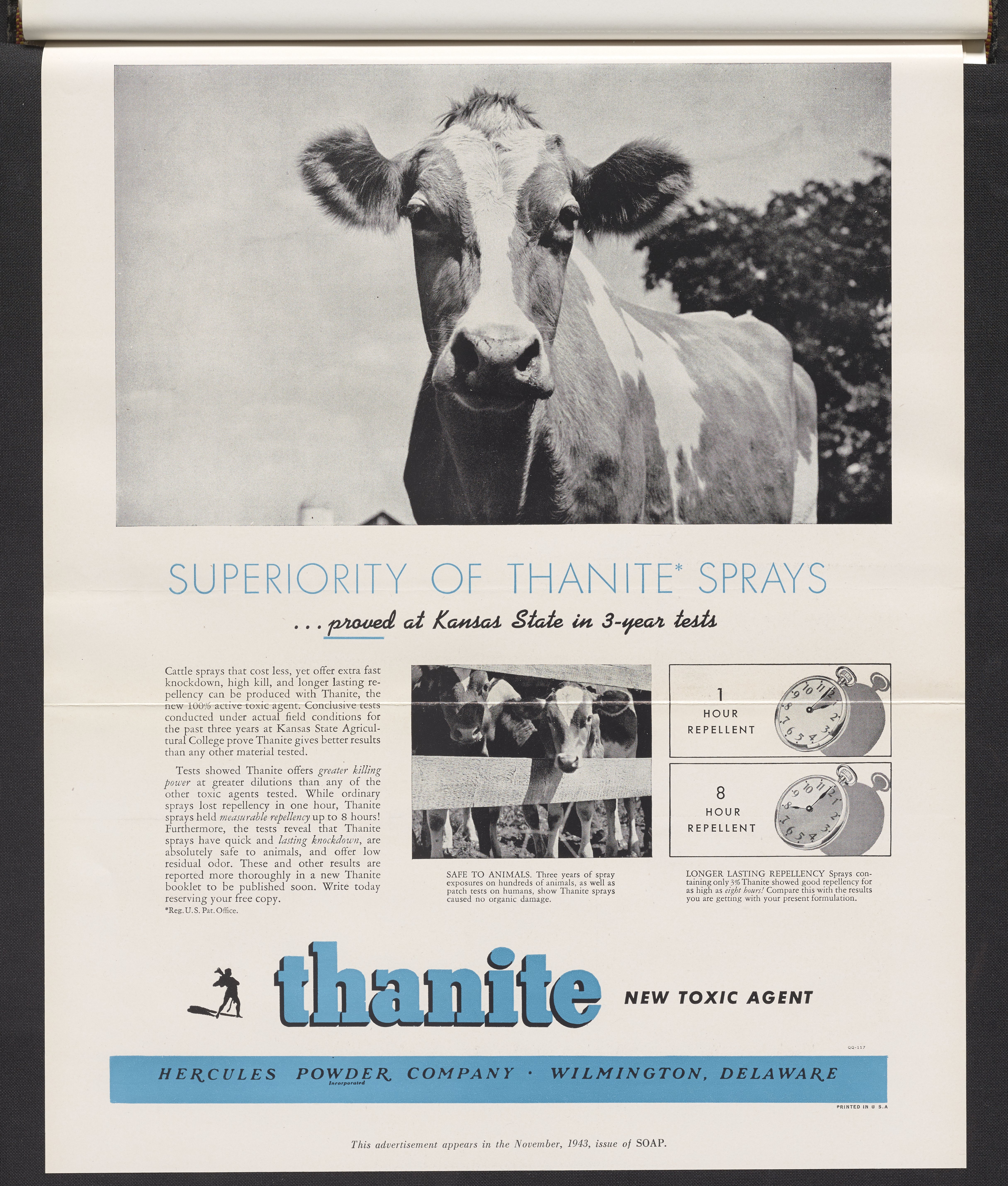 Advertisement for Thanite, a toxicant manufactured and sold by the Hercules Powder Company for use in pesticides and insecticides. This advertisement appeared in the November 1943 issue of Soap.